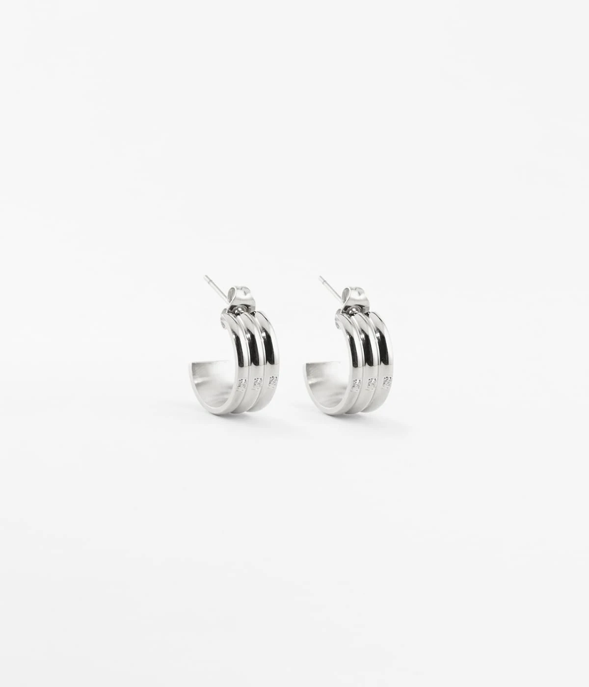 Boucles d’oreilles créoles en acier uni ou doré à l’or fin dont chaque boucle à l’apparence striée, est sertie de trois zirconiums.