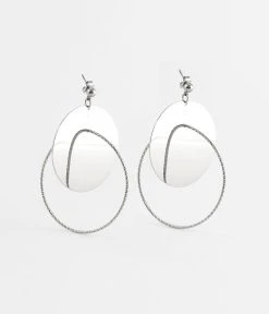 Boucles d’oreilles longues en acier uni ou doré à l’or fin. Un cercle martelé est attaché à un disque en acier et les ronds s’entremêlent pour nous perdre dans cette géométrie défiant les lois de la gravité.