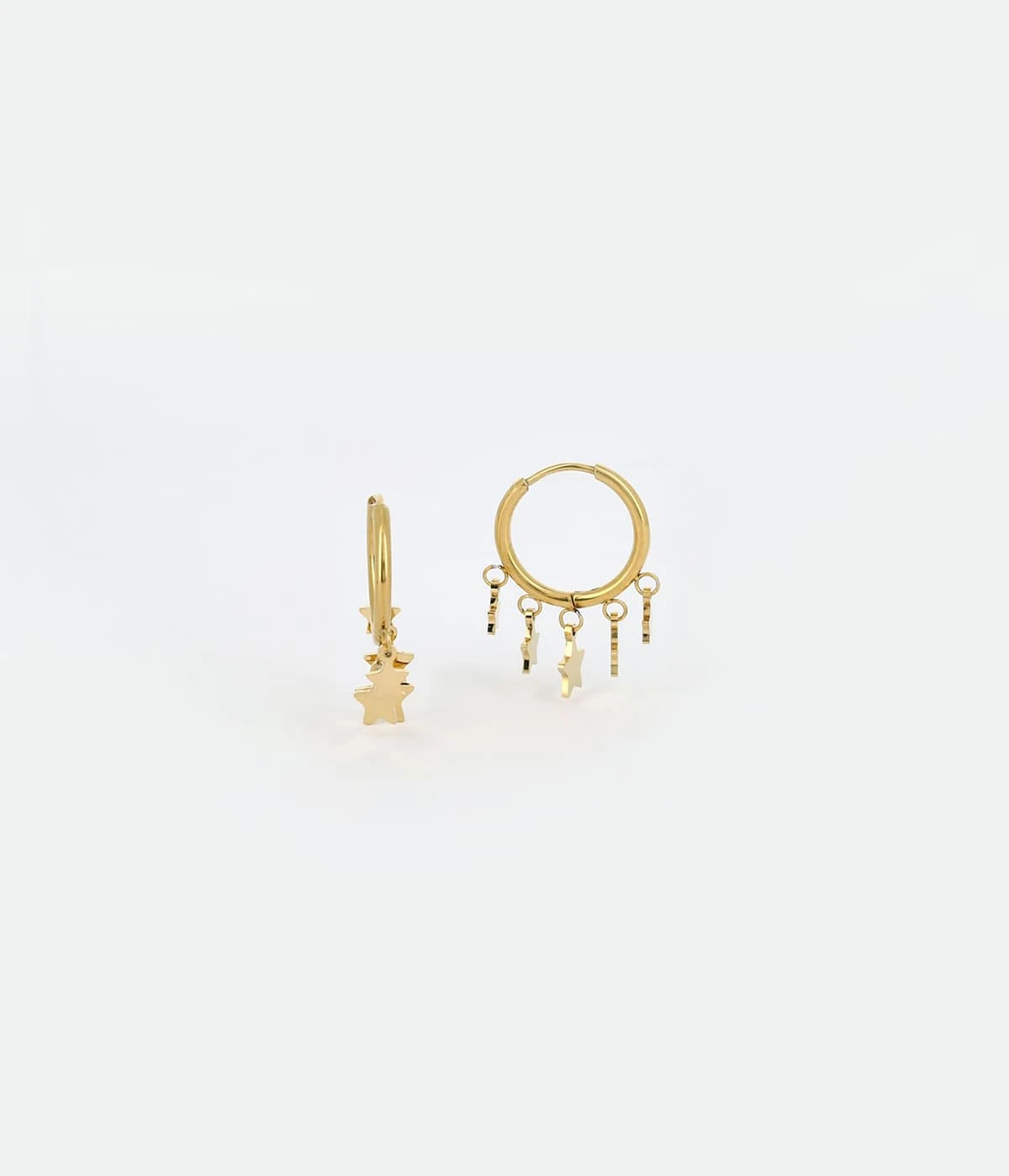 Boucles d’oreilles créoles en acier uni ou doré à l’or fin sur lesquelles sont suspendues cinq pampilles en forme d’étoile.