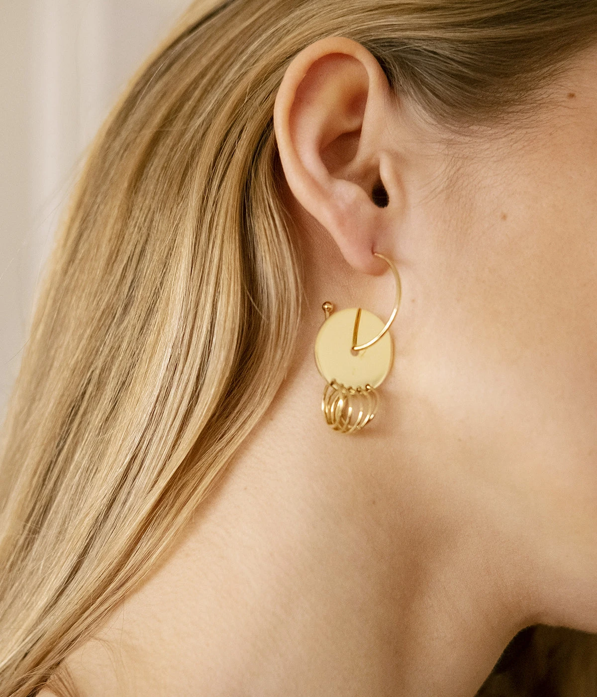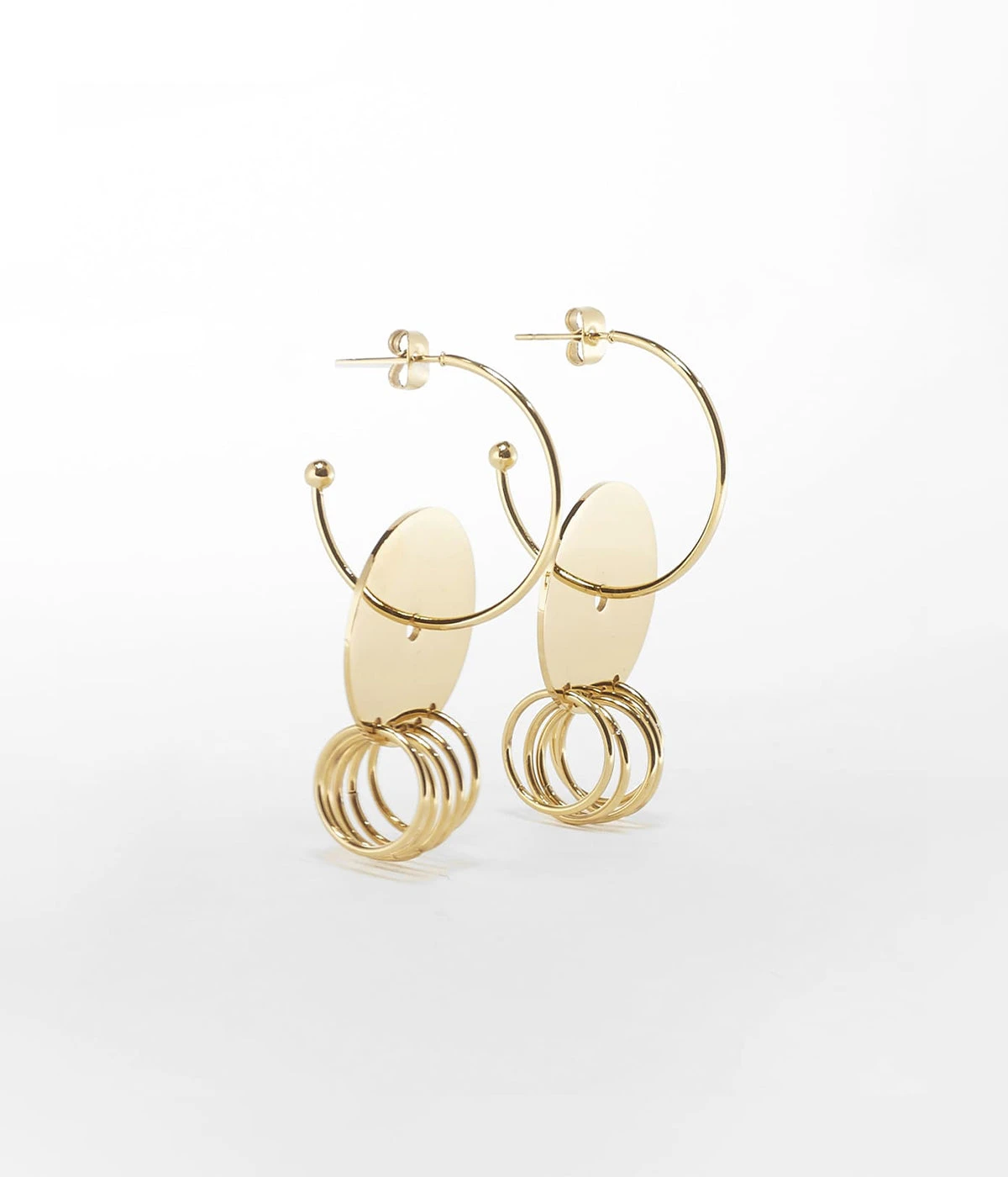 Boucles d’oreilles créoles en acier uni ou doré à l’or fin décorées de pastilles de métal auxquelles sont accrochées une multitude de petits anneaux.
