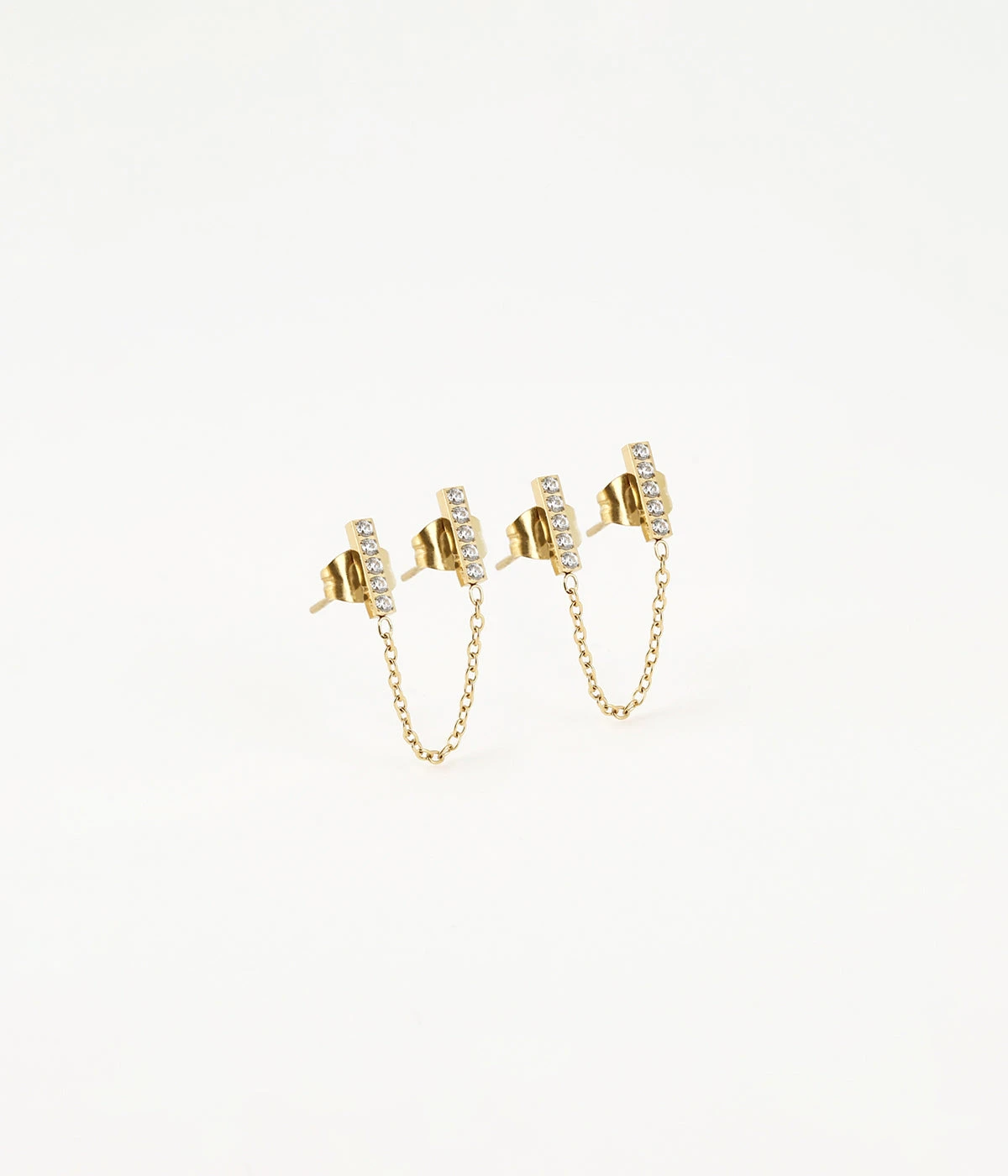 Boucles d’oreilles chaînettes en acier uni ou doré à l’or fin en forme de barrettes serties de zirconiums.