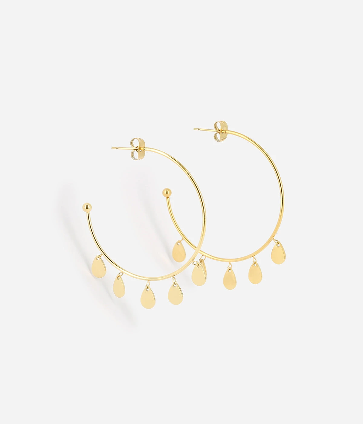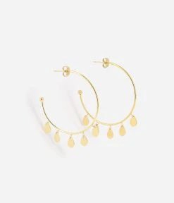 Boucles d’oreilles créoles en acier uni ou doré à l’or fin sur lesquelles sont suspendues des pastilles en forme de goutte.