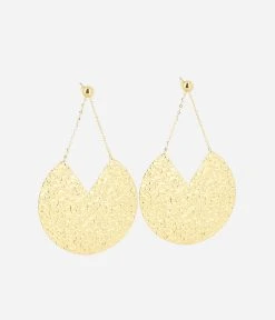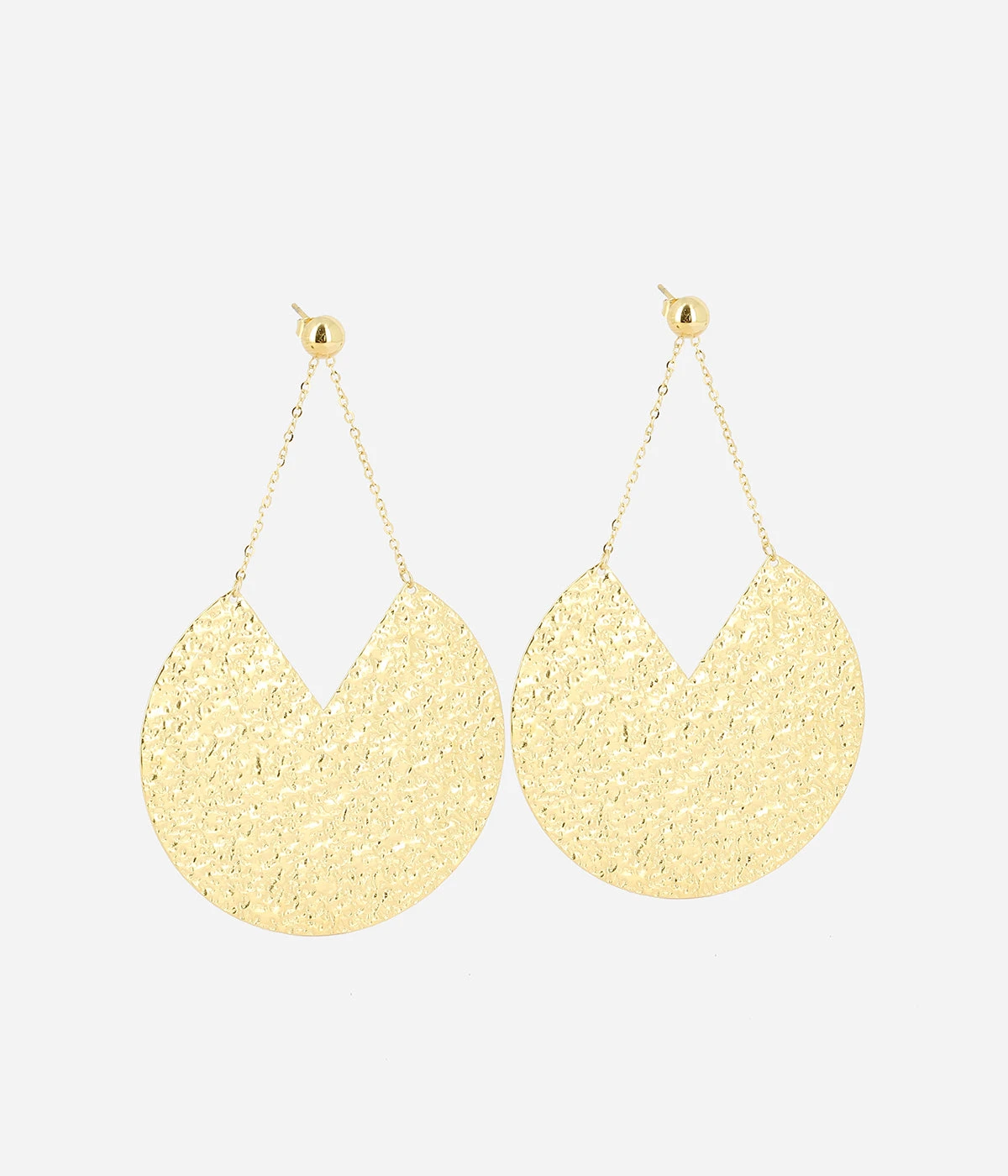 Boucles d’oreilles en acier doré à l’or fin. Une chaînette relie un cercle martelé.