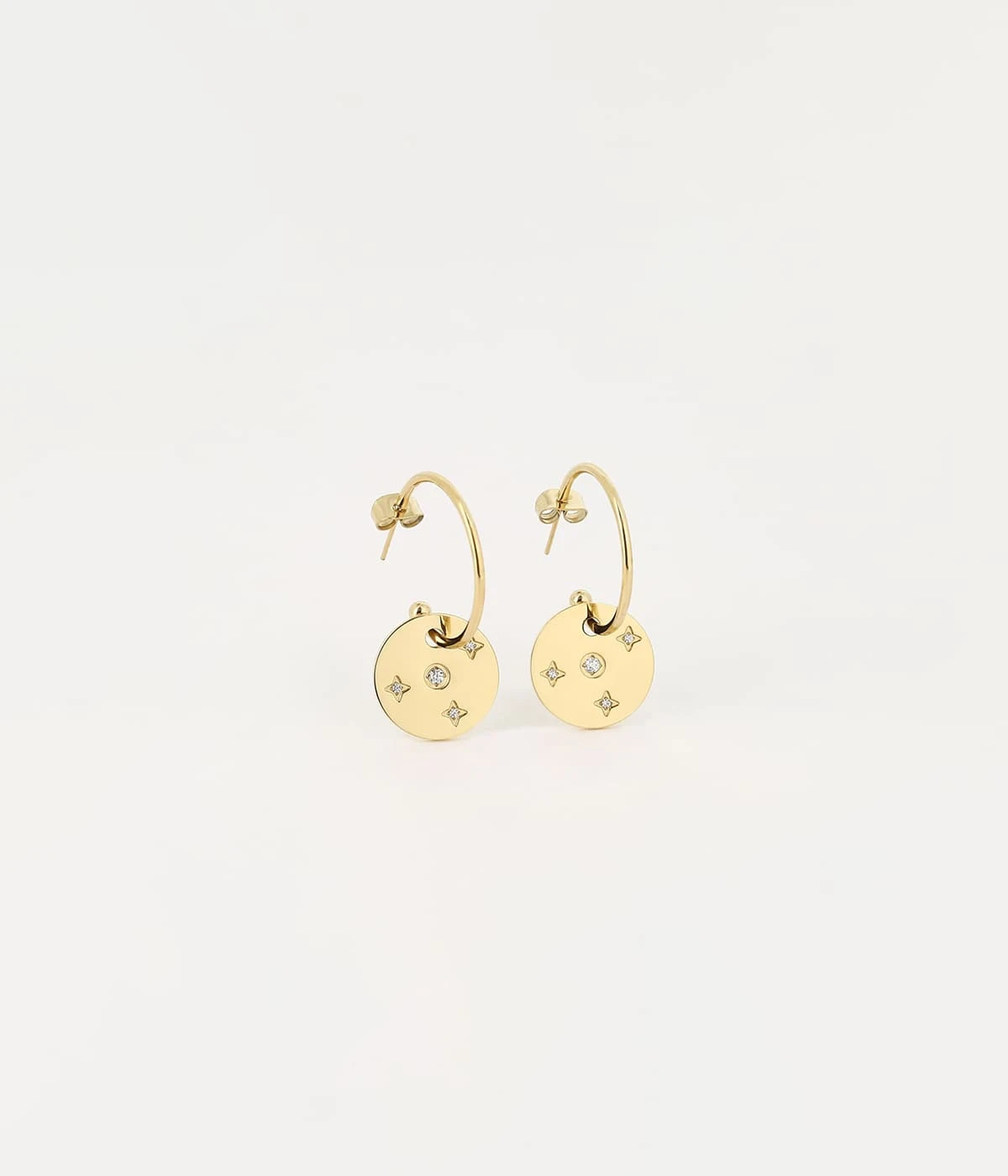Boucles d’oreilles créoles en acier uni ou doré à l’or fin sur lesquelles sont suspendus un rond avec des étoiles serties de zirconiums.