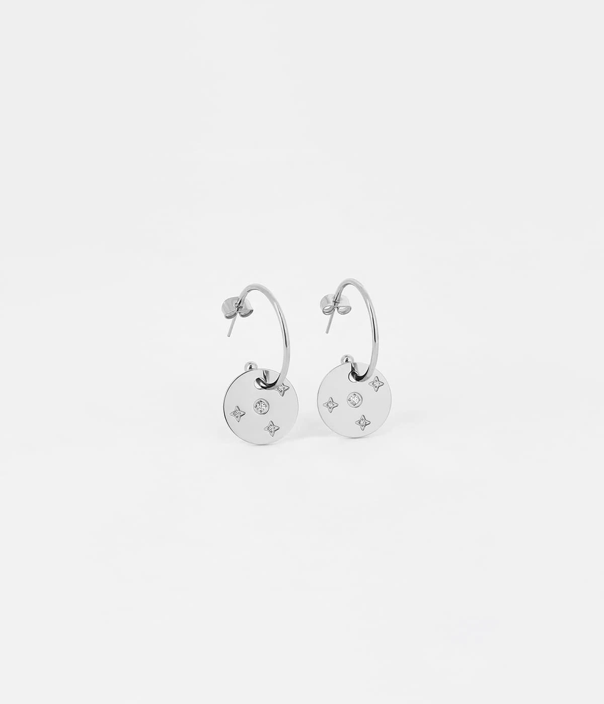 Boucles d’oreilles créoles en acier uni ou doré à l’or fin sur lesquelles sont suspendus un rond avec des étoiles serties de zirconiums.