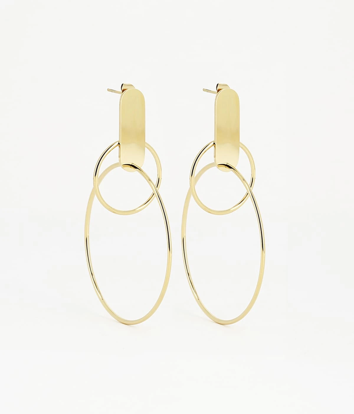 Boucles d’oreilles en acier uni et doré à l’or fin. Ces boucles d’oreilles sont grandes et rigides et s’installent au creux du cou comme une pièce d’architecture illuminant le visage.