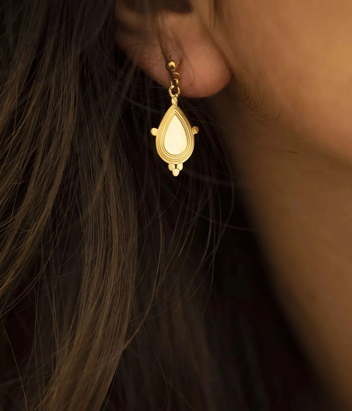 Boucles d’oreilles en acier uni ou doré à l’or fin. Les pampilles de métal en forme de poire sont gravées et terminées de petites boules.