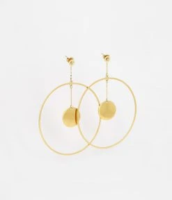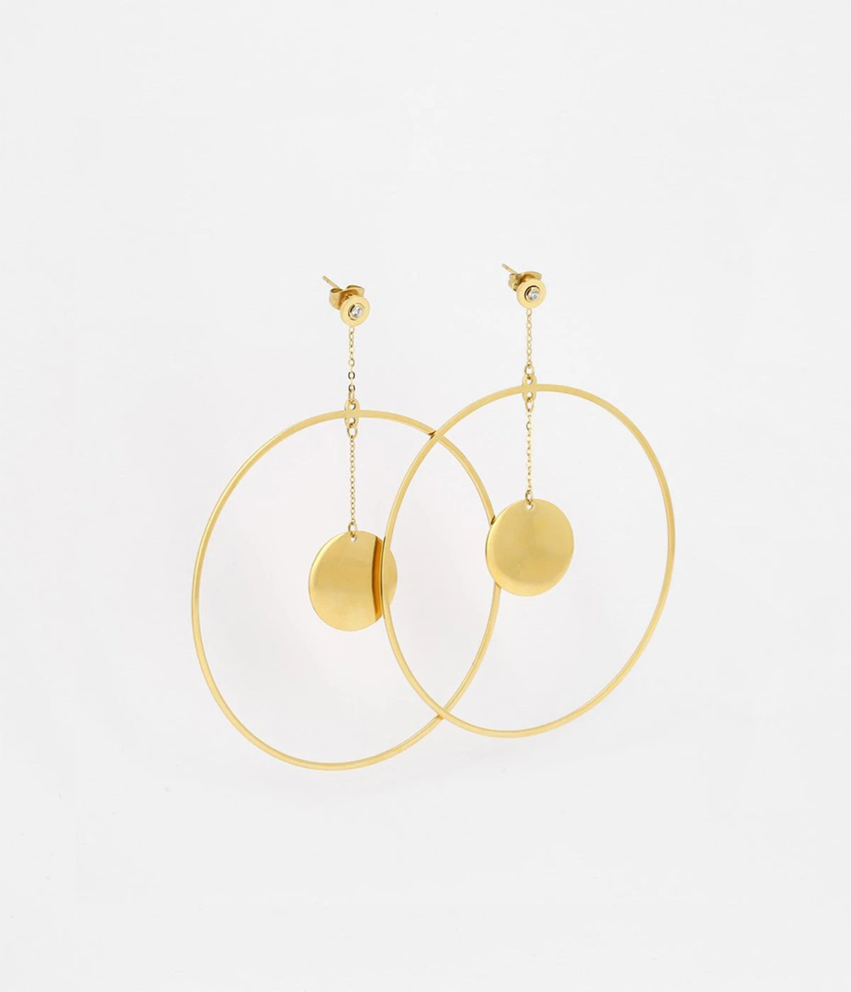 Boucles d’oreilles en acier doré à l’or fin. Une chaînette relie un anneau et un motif de forme ronde.