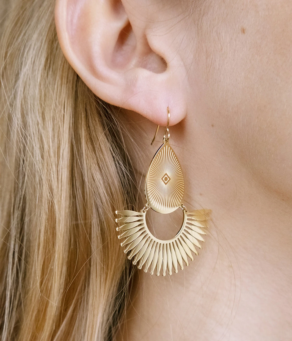 Boucles d’oreilles en acier uni ou doré à l’or fin composées de petites pendeloques striées auxquelles sont suspendus des cercles à l’aspect dentelé.