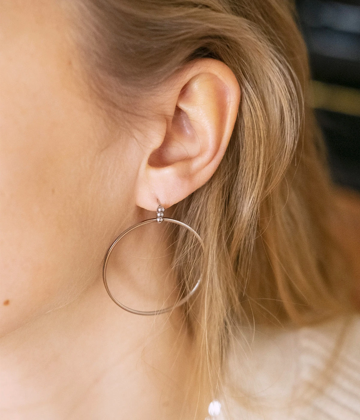 Boucles d’oreilles pendantes en acier uni ou doré à l’or fin composées d’un cercle en métal.