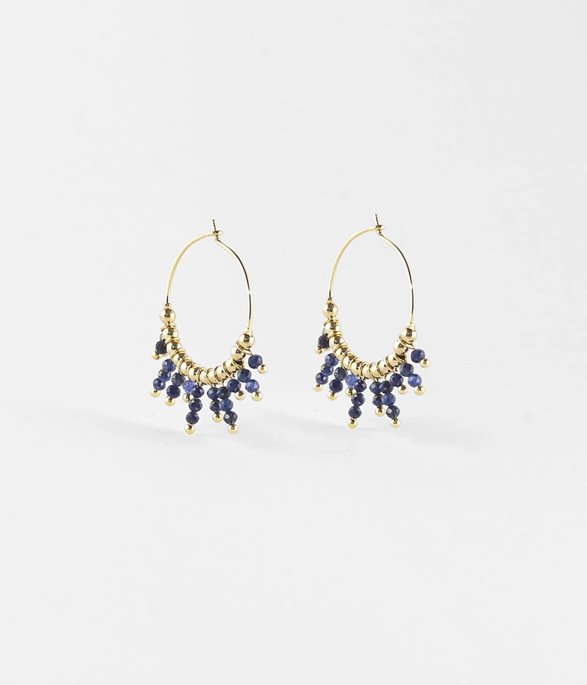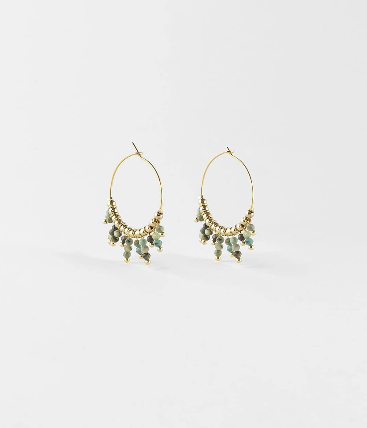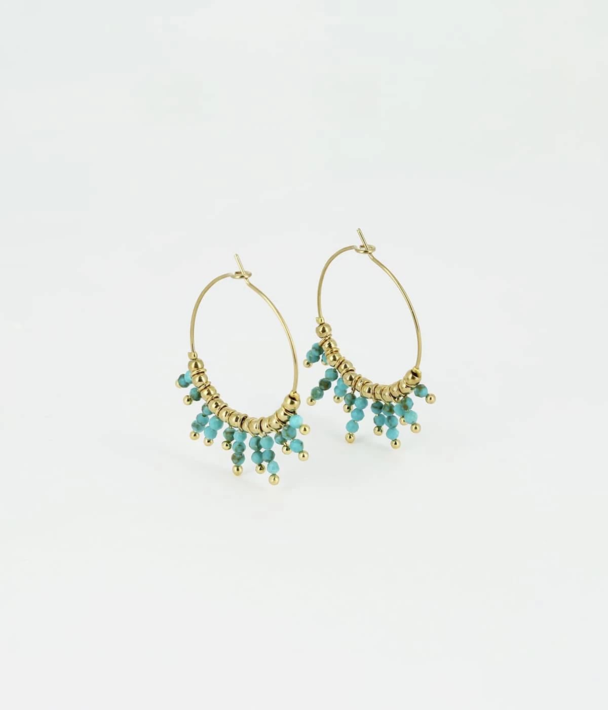 Boucles d’oreilles créoles en acier doré à l’or fin, bordées de petites boules dorées puis terminées par une grappe de pampilles en pierres fines.