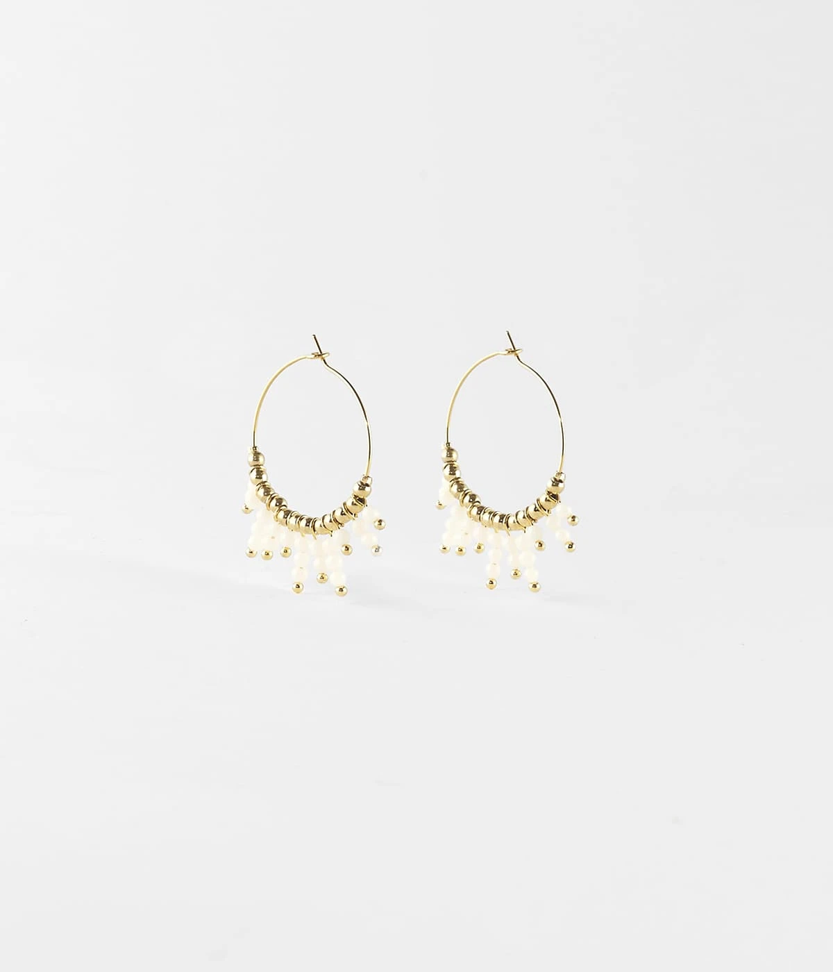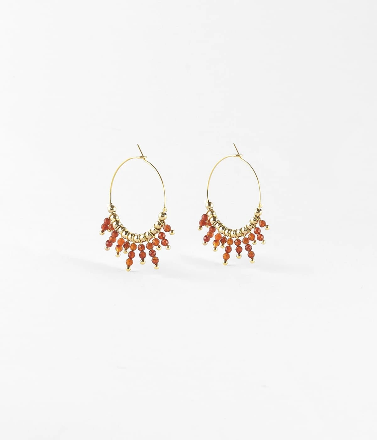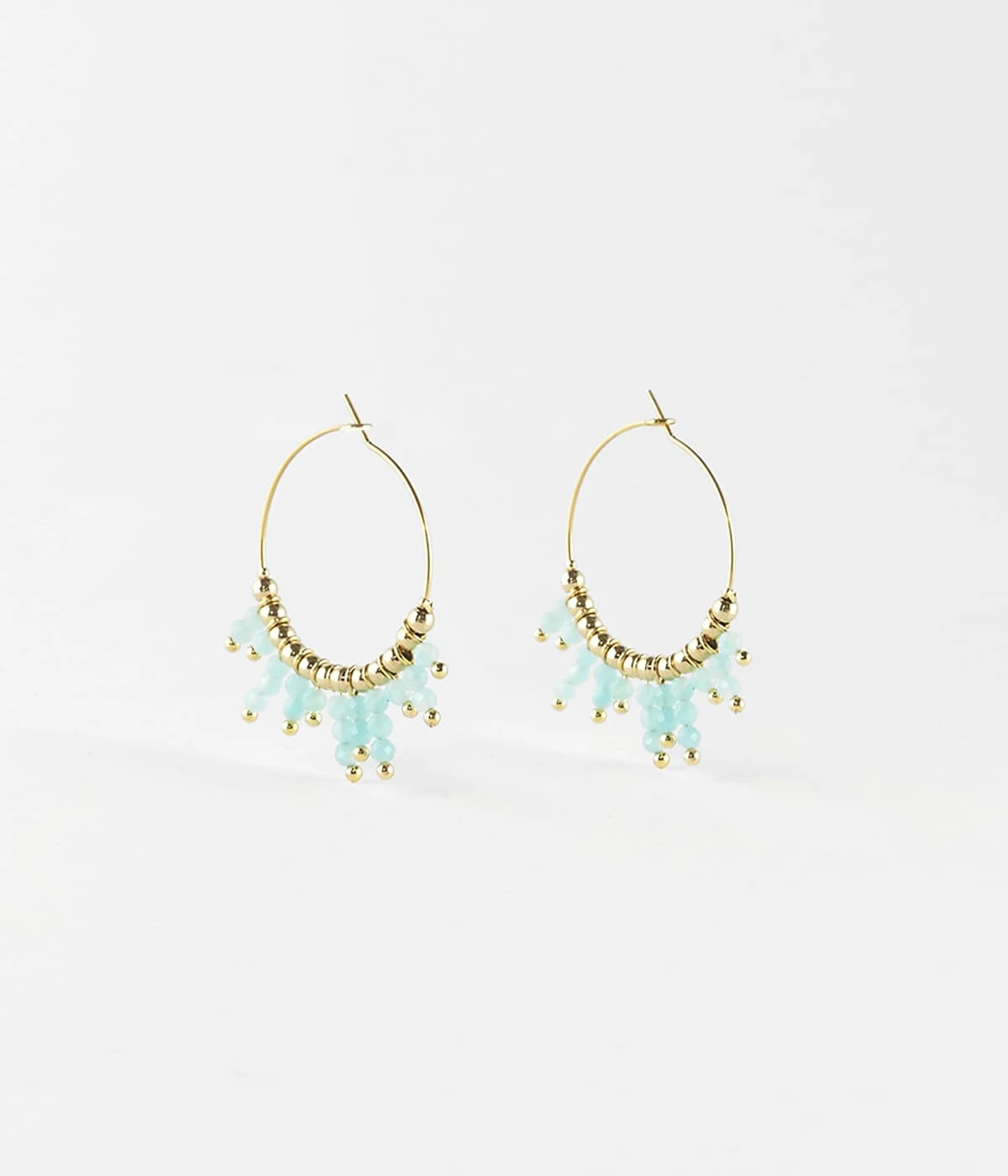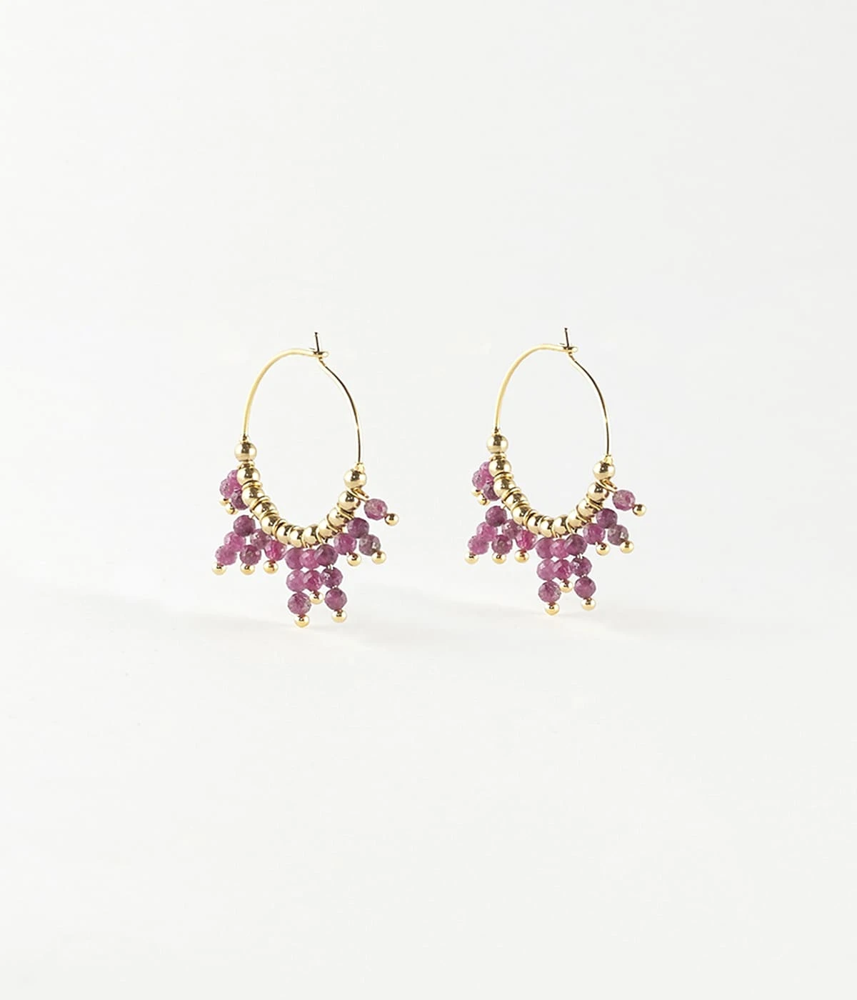 Boucles d’oreilles créoles en acier doré à l’or fin, bordées de petites boules dorées puis terminées par une grappe de pampilles en pierres fines.