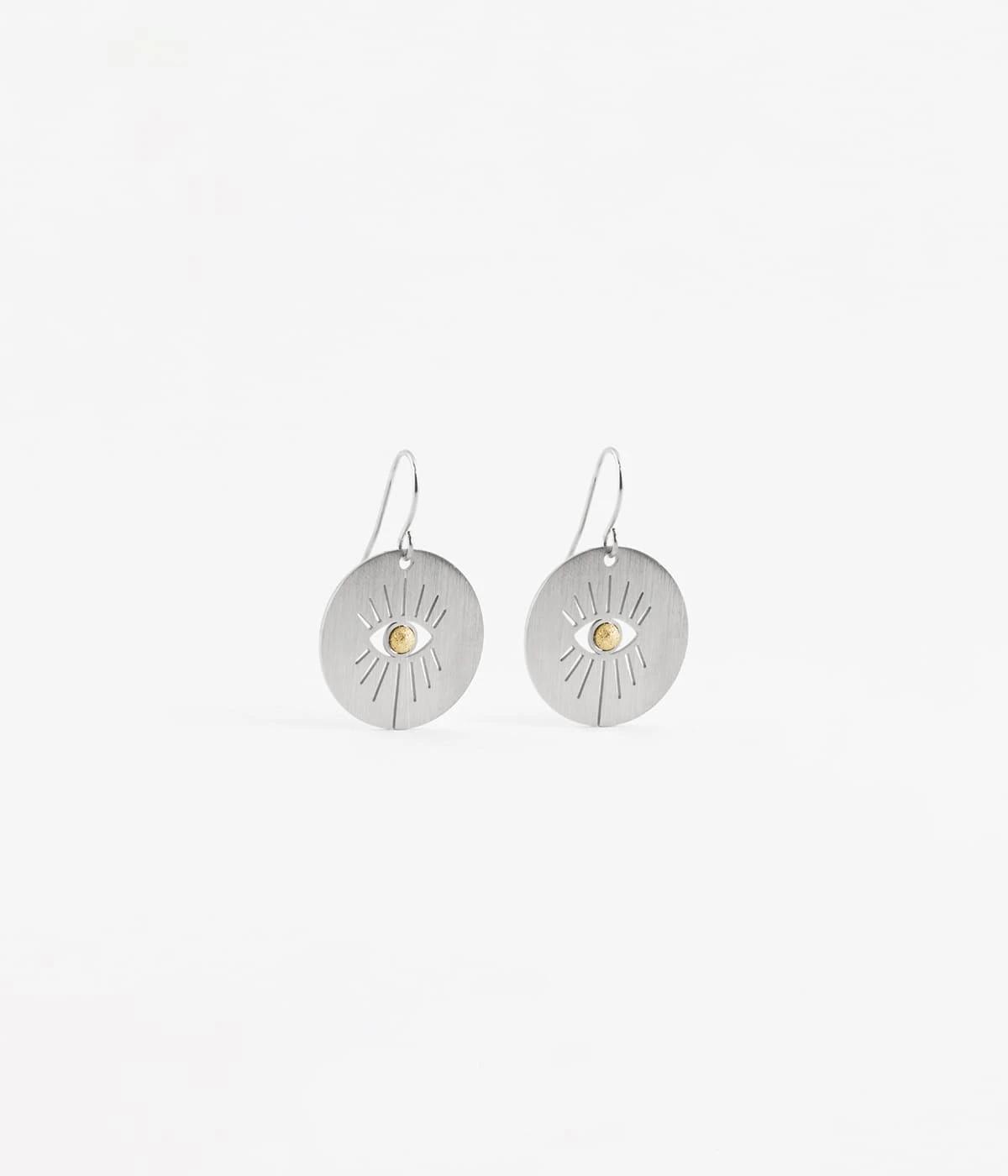 Boucles d’oreilles dormeuses, en acier uni ou doré à l’or fin sur lesquelles sont attachées deux médailles au motif d’inspiration égyptienne.