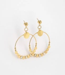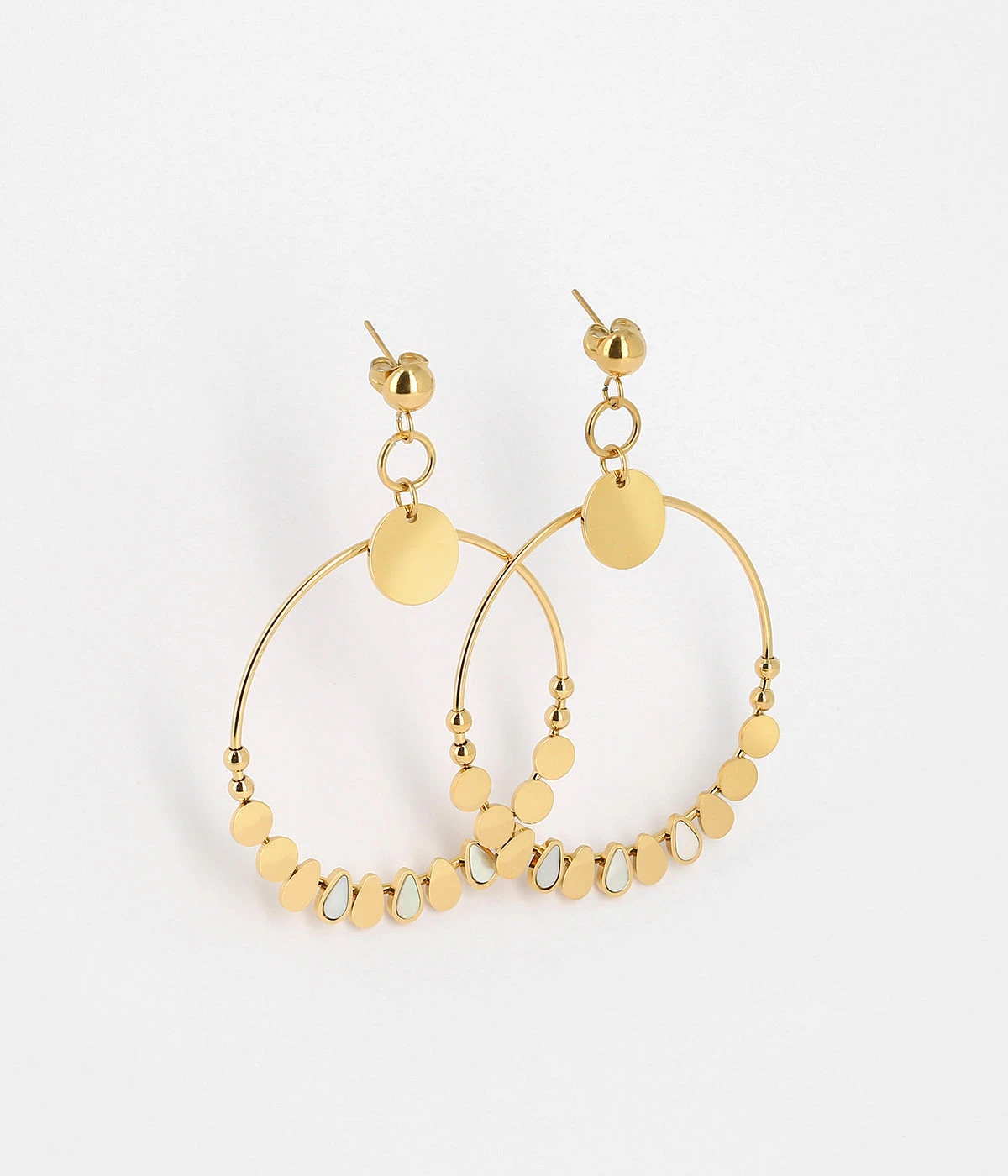 Boucles d’oreilles longues doré à l’or fin, formées de différents motifs en nacre.