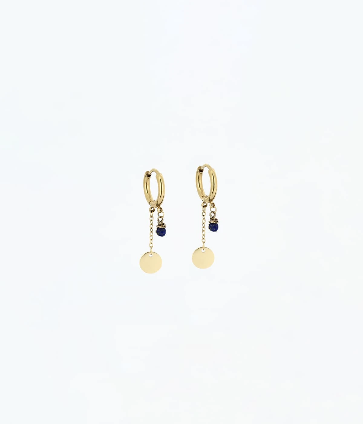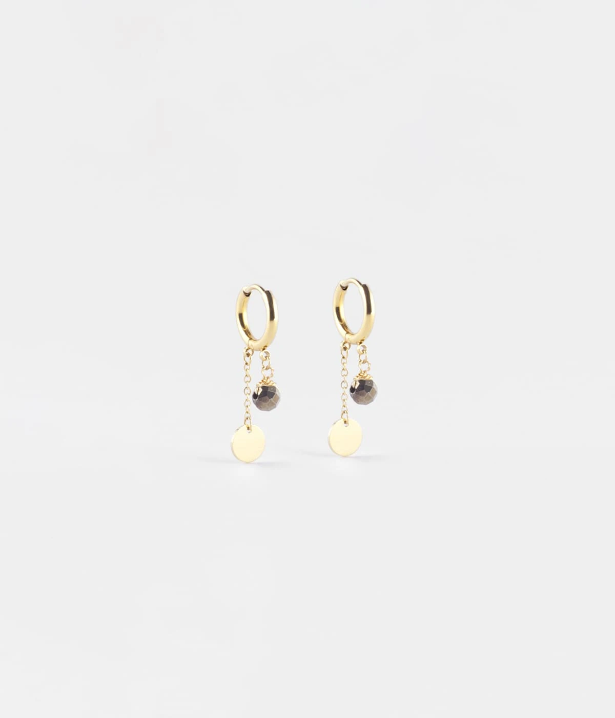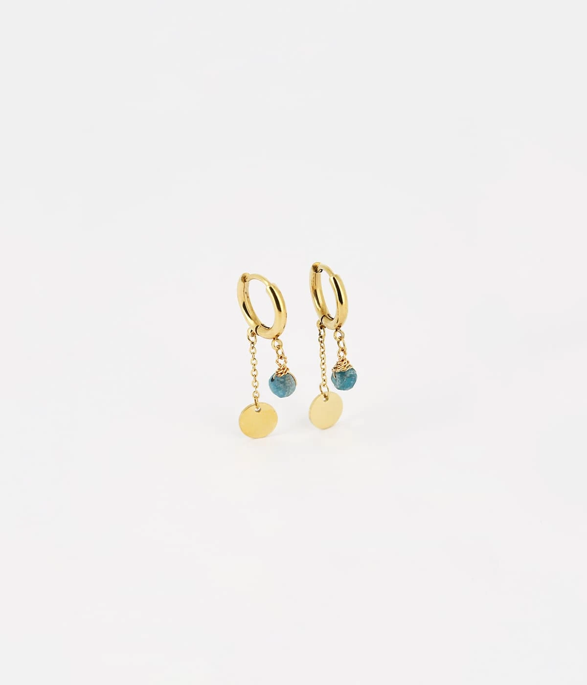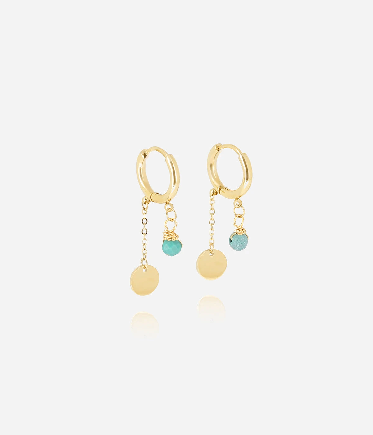 Petites créoles en acier doré à l’or fin sur lesquelles pendent deux petites chaînettes, l’une terminée d’une bille de pierre naturelle et l’autre, d’une petite médaille.