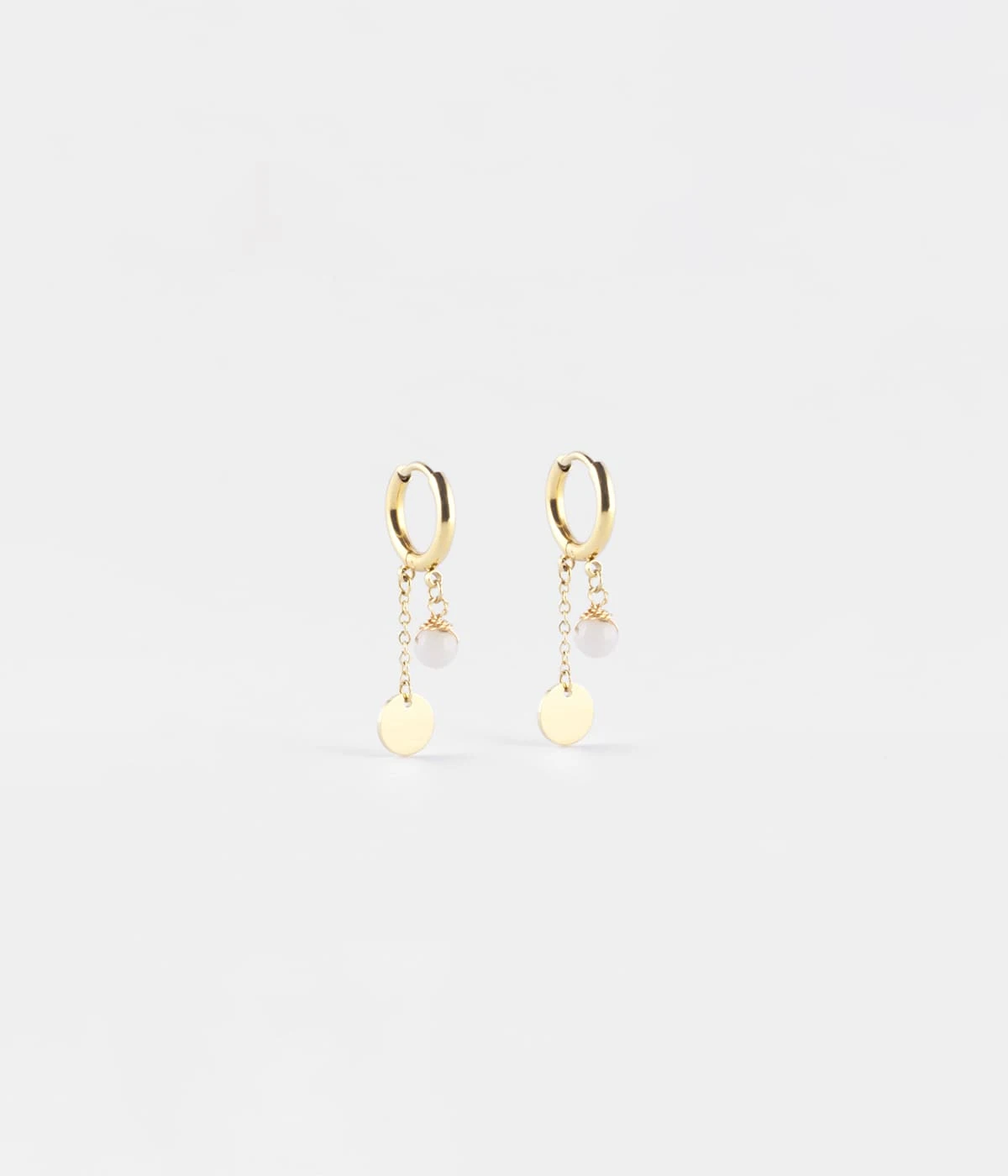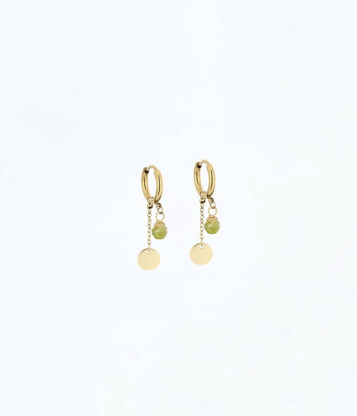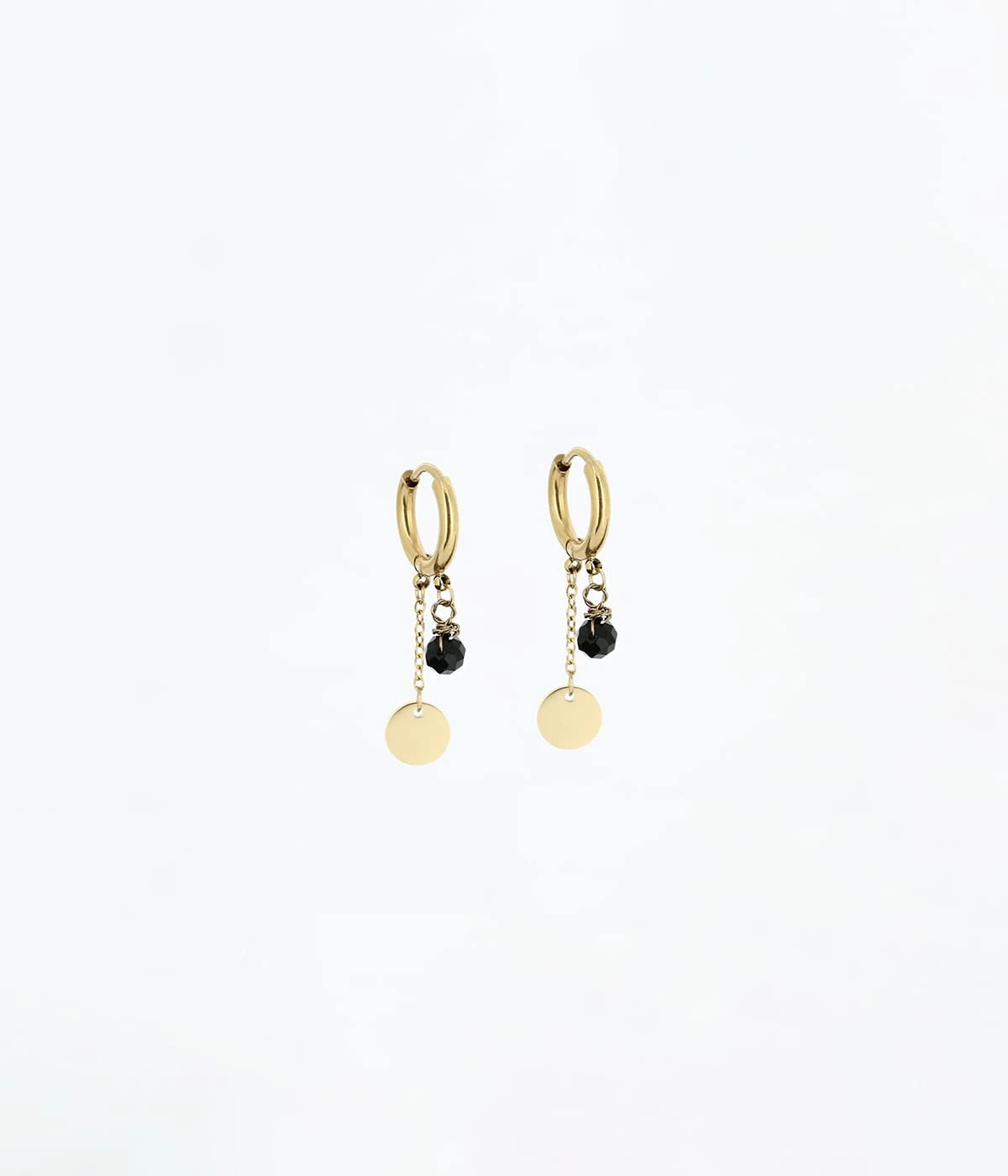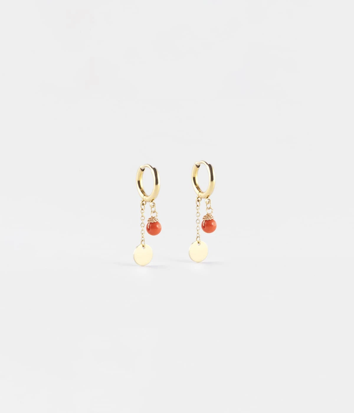 Petites créoles en acier doré à l’or fin sur lesquelles pendent deux petites chaînettes, l’une terminée d’une bille de pierre naturelle et l’autre, d’une petite médaille.