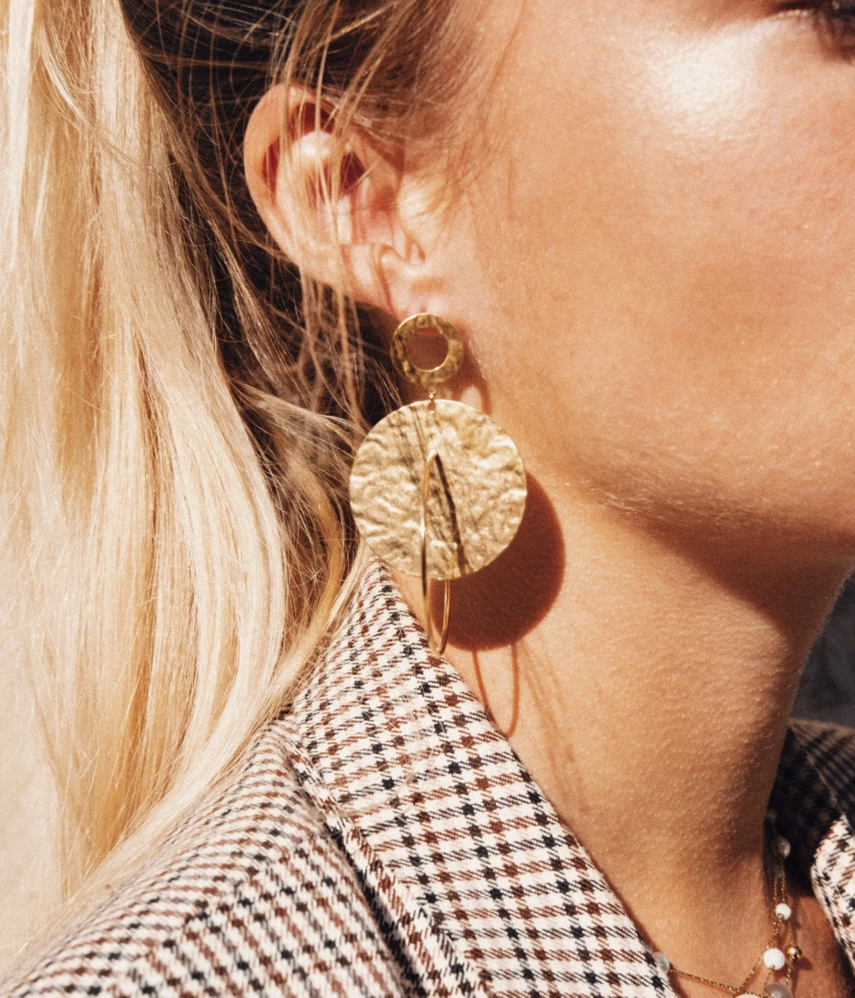 Boucles d’oreilles longues en acier uni ou doré à l’or fin. Deux disques martelés sont attachés à un cercle plus fin et les ronds s’entremêlent pour nous perdre dans cette géométrie défiant les lois de la gravité. Ces boucles captent la lumière et apportent beaucoup d’éclat au visage.