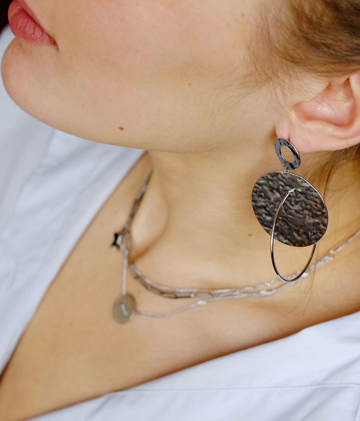Boucles d’oreilles longues en acier uni ou doré à l’or fin. Deux disques martelés sont attachés à un cercle plus fin et les ronds s’entremêlent pour nous perdre dans cette géométrie défiant les lois de la gravité. Ces boucles captent la lumière et apportent beaucoup d’éclat au visage.