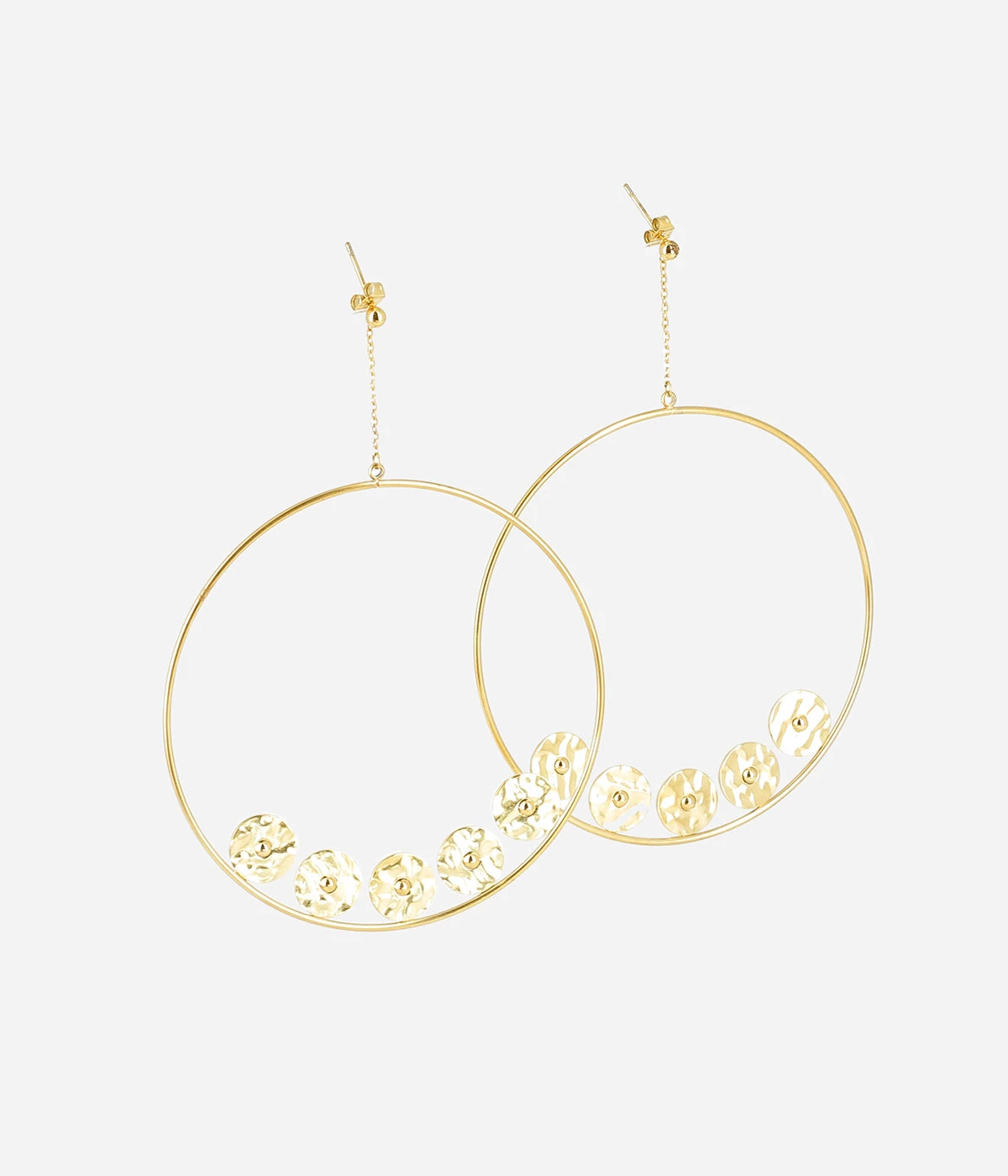 Boucles d’oreilles en acier doré à l’or fin. Un anneau composé de cinq pastilles martelées est relié à la base par une chaînette.