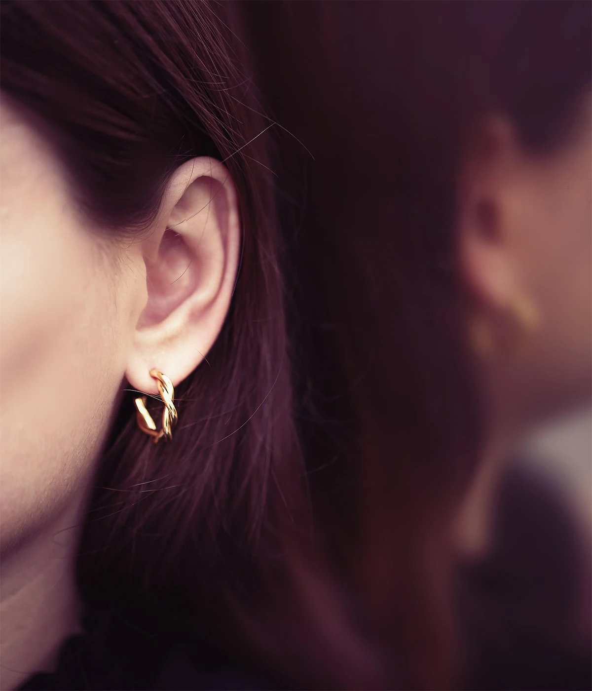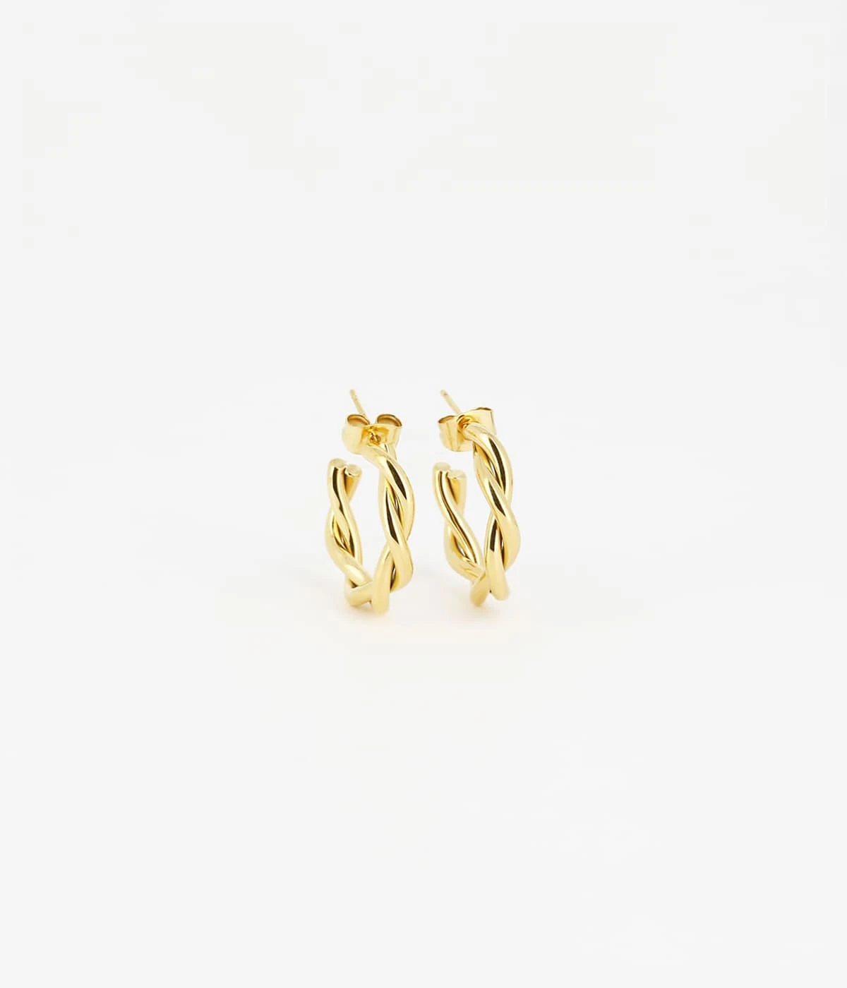 Boucles d’oreilles créoles en acier uni ou doré à l’or fin imitant une forme torsadée desserrée.