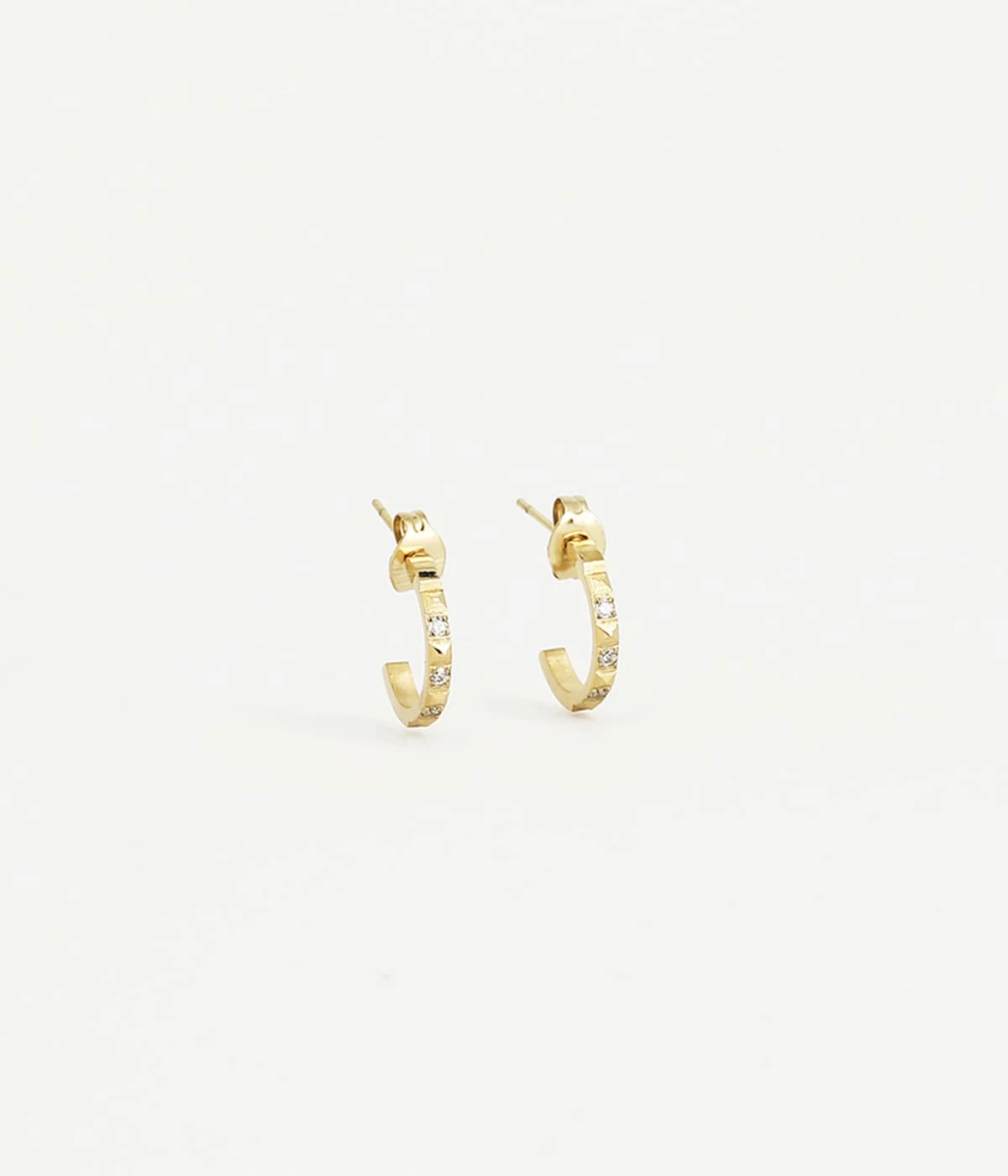 Boucles d’oreilles créoles en acier uni ou dorées à l’or fin ciselées de petites pyramides et pavées de petits zirconiums brillants.