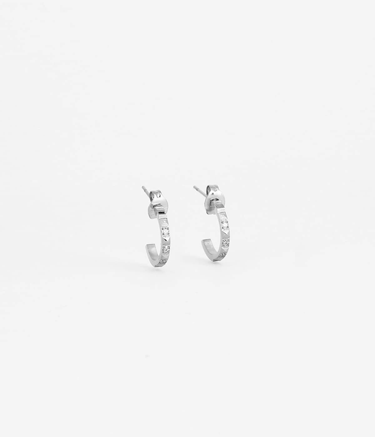 Boucles d’oreilles créoles en acier uni ou dorées à l’or fin ciselées de petites pyramides et pavées de petits zirconiums brillants.