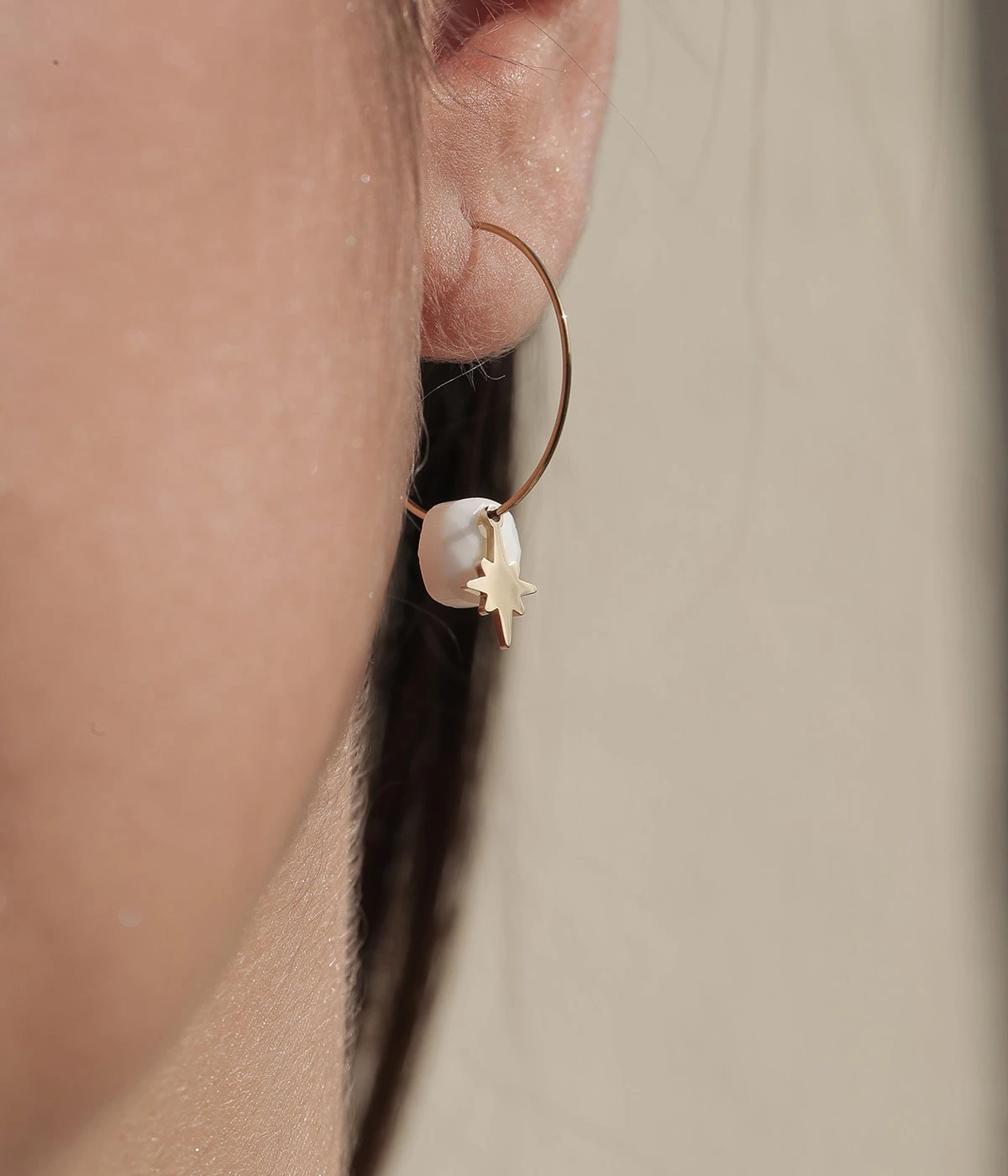 Boucles d’oreilles créoles en acier uni ou doré à l’or fin agrémentées d’une pierre naturelle facettée et d’une pampille de métal en forme d’étoile du Sud.