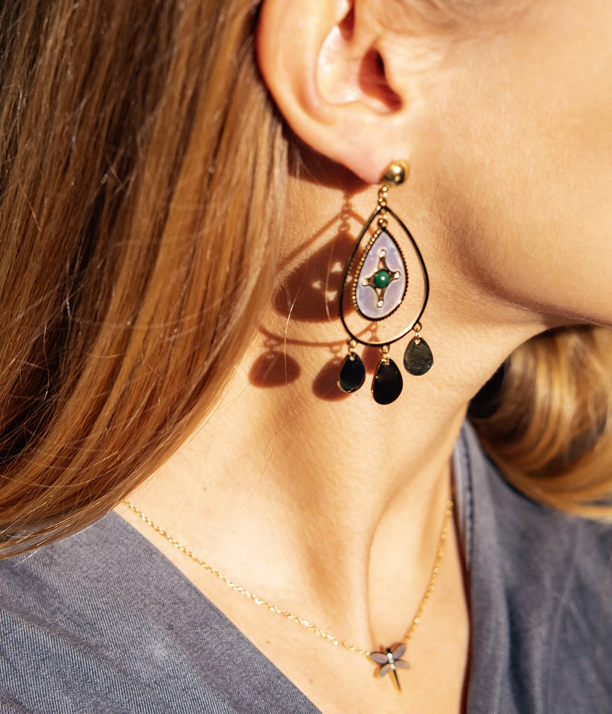 Ces boucles très élégantes habillent toutes les tenues. La nacre et la malachite apportent de l’éclat près de votre visage.