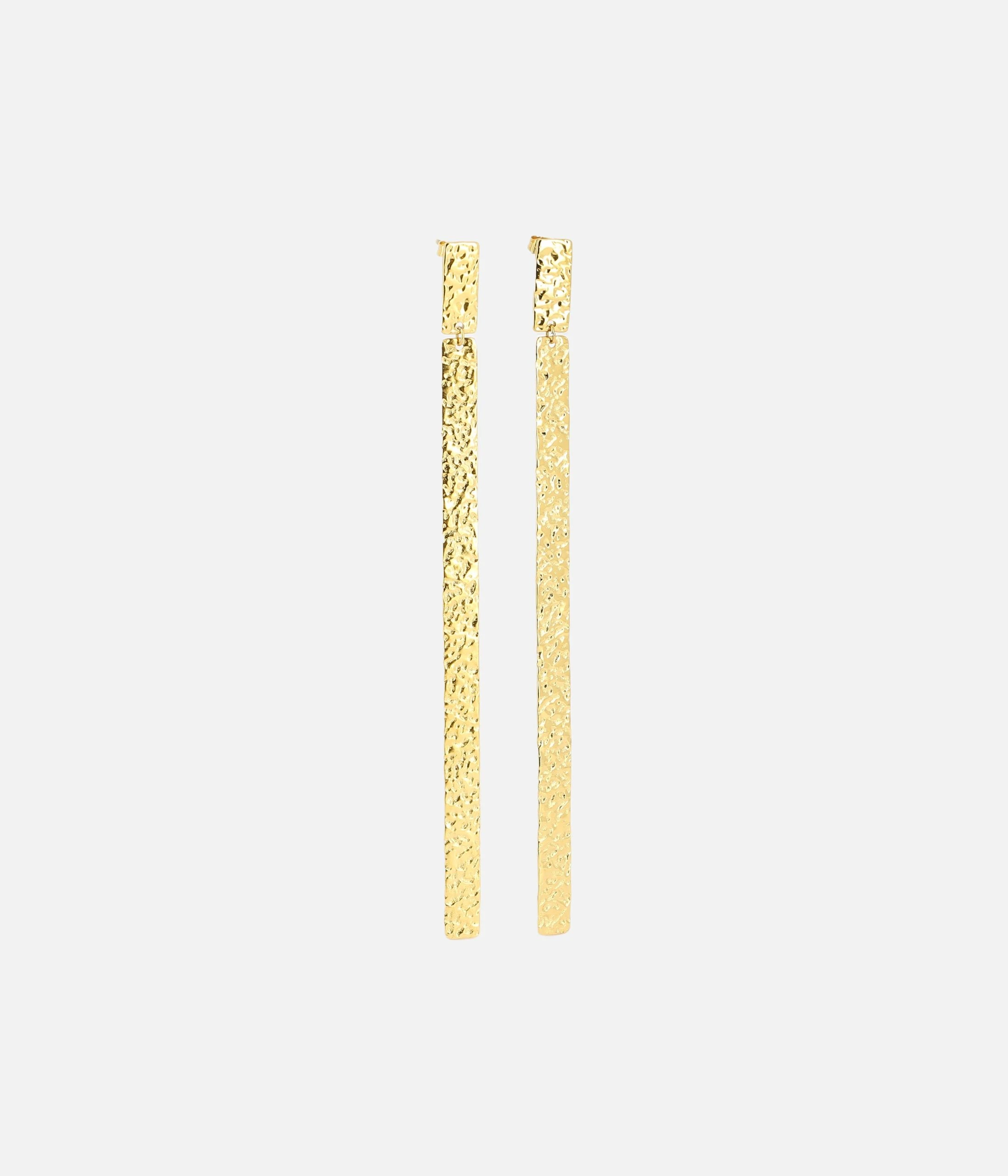 Boucles d’oreilles longues en acier doré à l’or fin de forme géométrique.