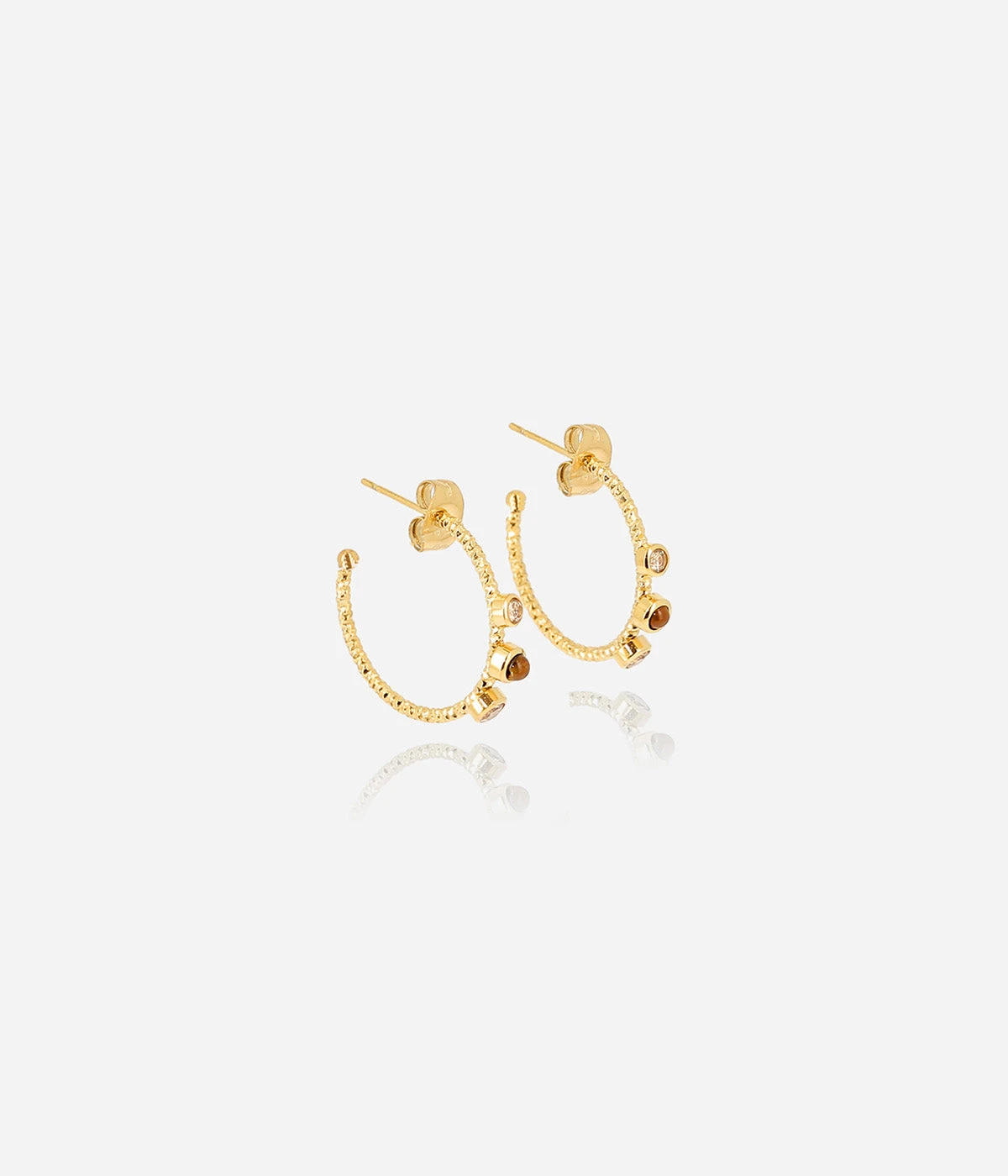 Boucles d’oreilles créoles en acier doré à l’or fin composées d’une pierre naturelle et de deux zirconiums colorés.