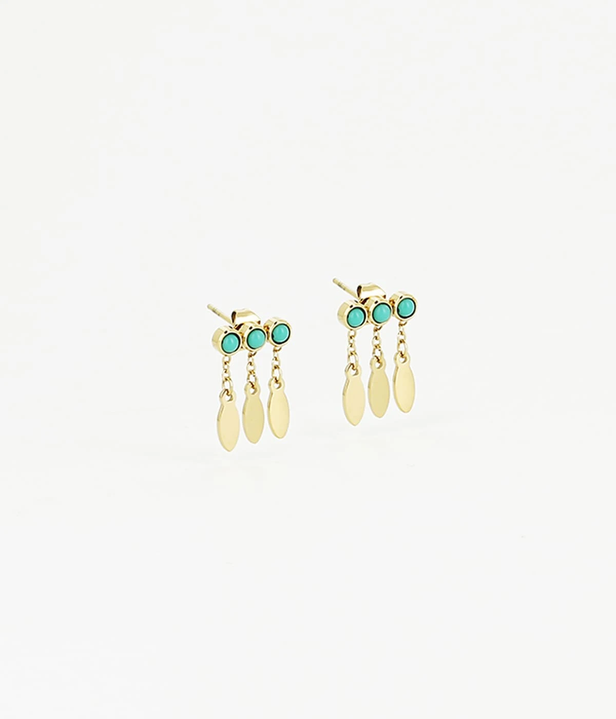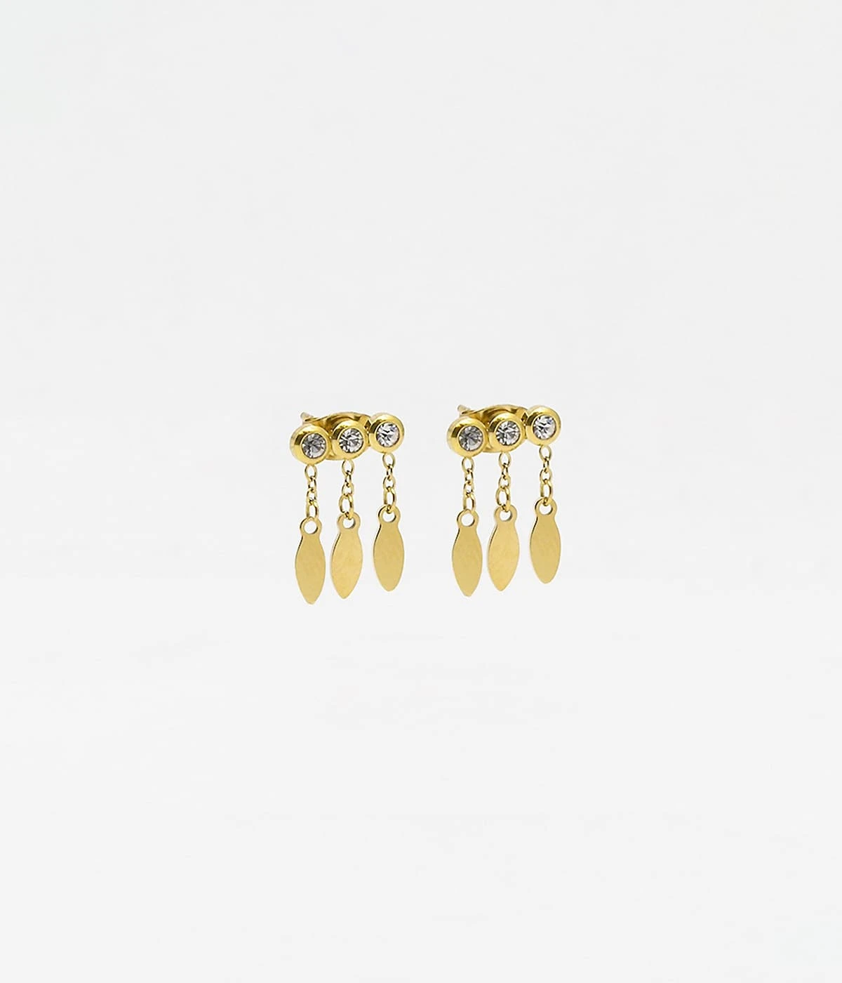 Boucles d’oreilles chaînettes en acier uni ou doré à l’or fin sur lesquelles sont serties trois pierres fines ou trois zirconiums brillants. D’autres petites chaînes sont attachées sur les pierres et se terminent de petites feuilles de métal finement découpées au laser dans nos ateliers.