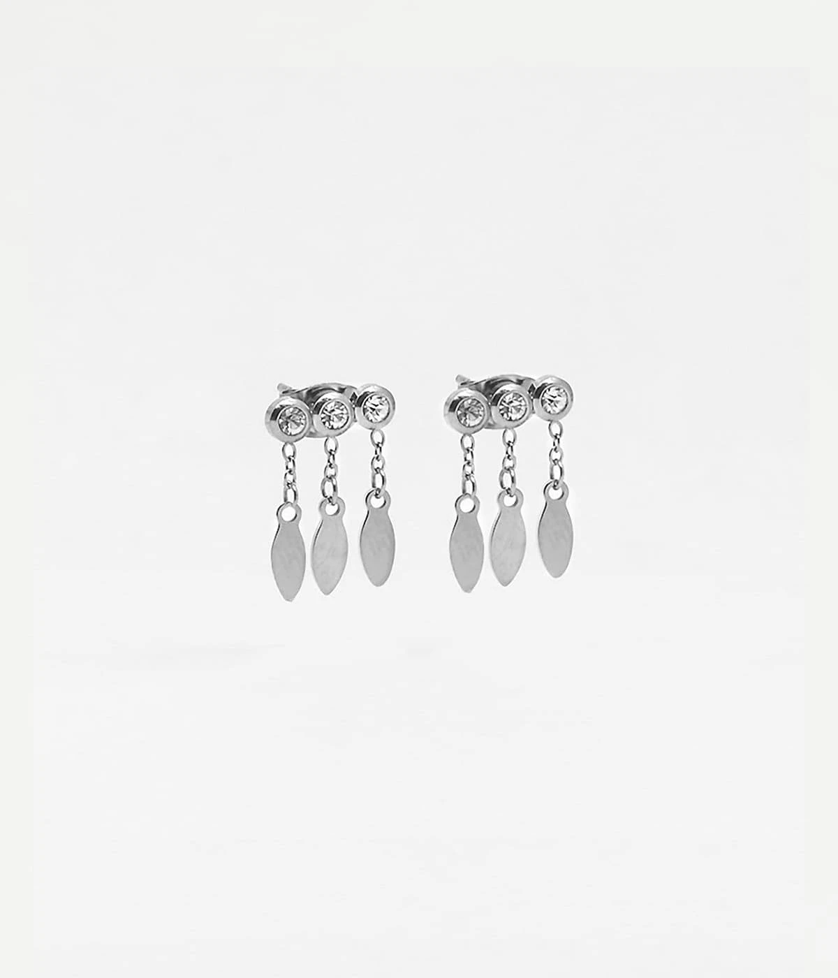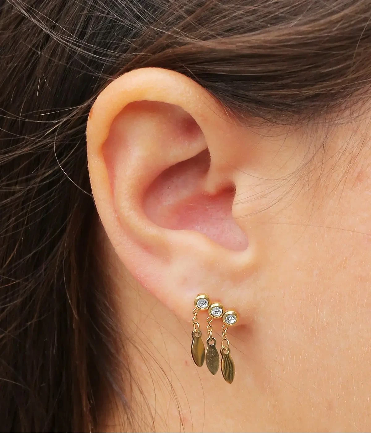 Boucles d’oreilles chaînettes en acier uni ou doré à l’or fin sur lesquelles sont serties trois zirconiums brillants. D’autres petites chaînes sont attachées sur les pierres et se terminent de petites feuilles de métal finement découpées au laser dans nos ateliers.