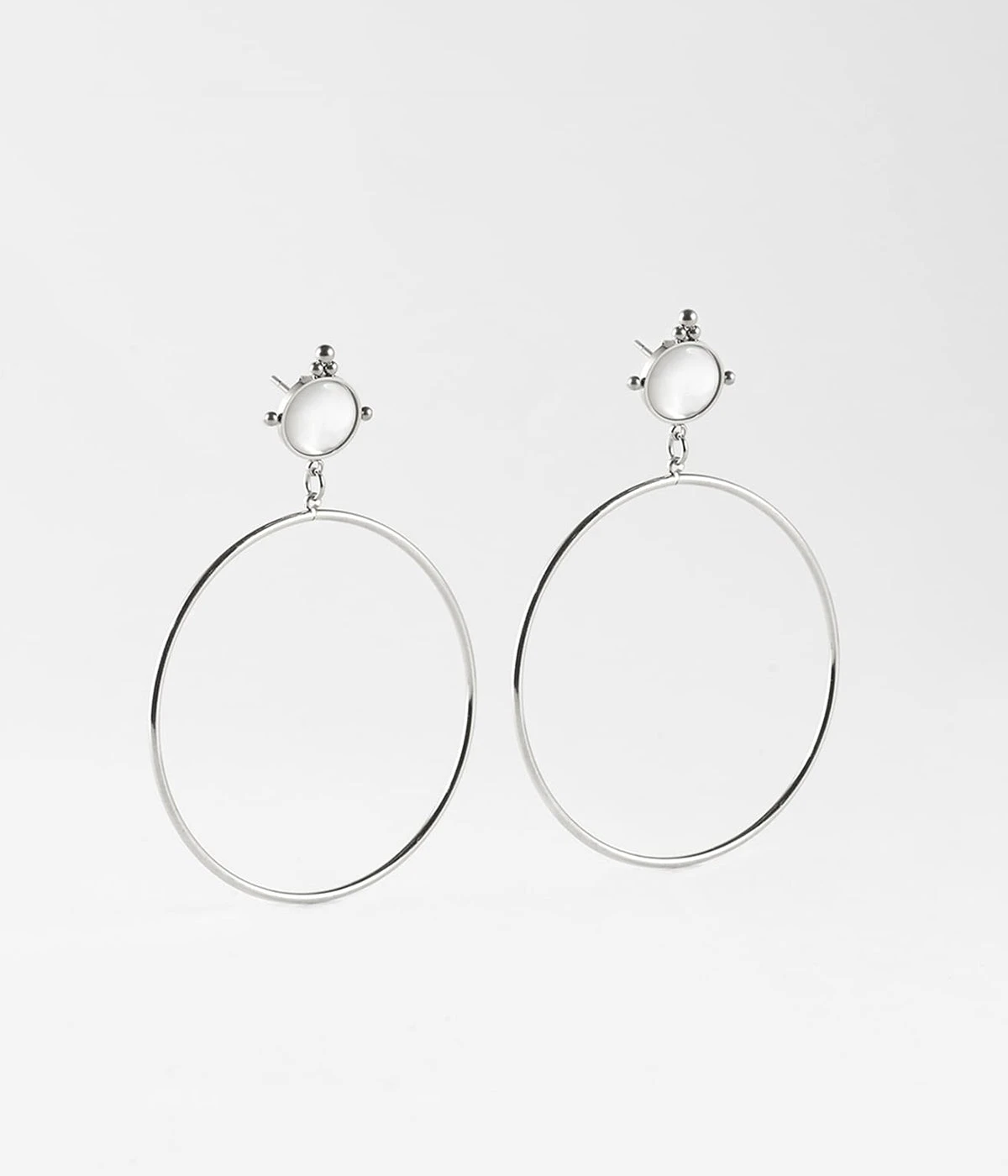 Boucles d’oreilles créoles en acier uni ou doré à l’or fin dont l’attache sur l’oreille, est une petite médaille sertie de nacre.