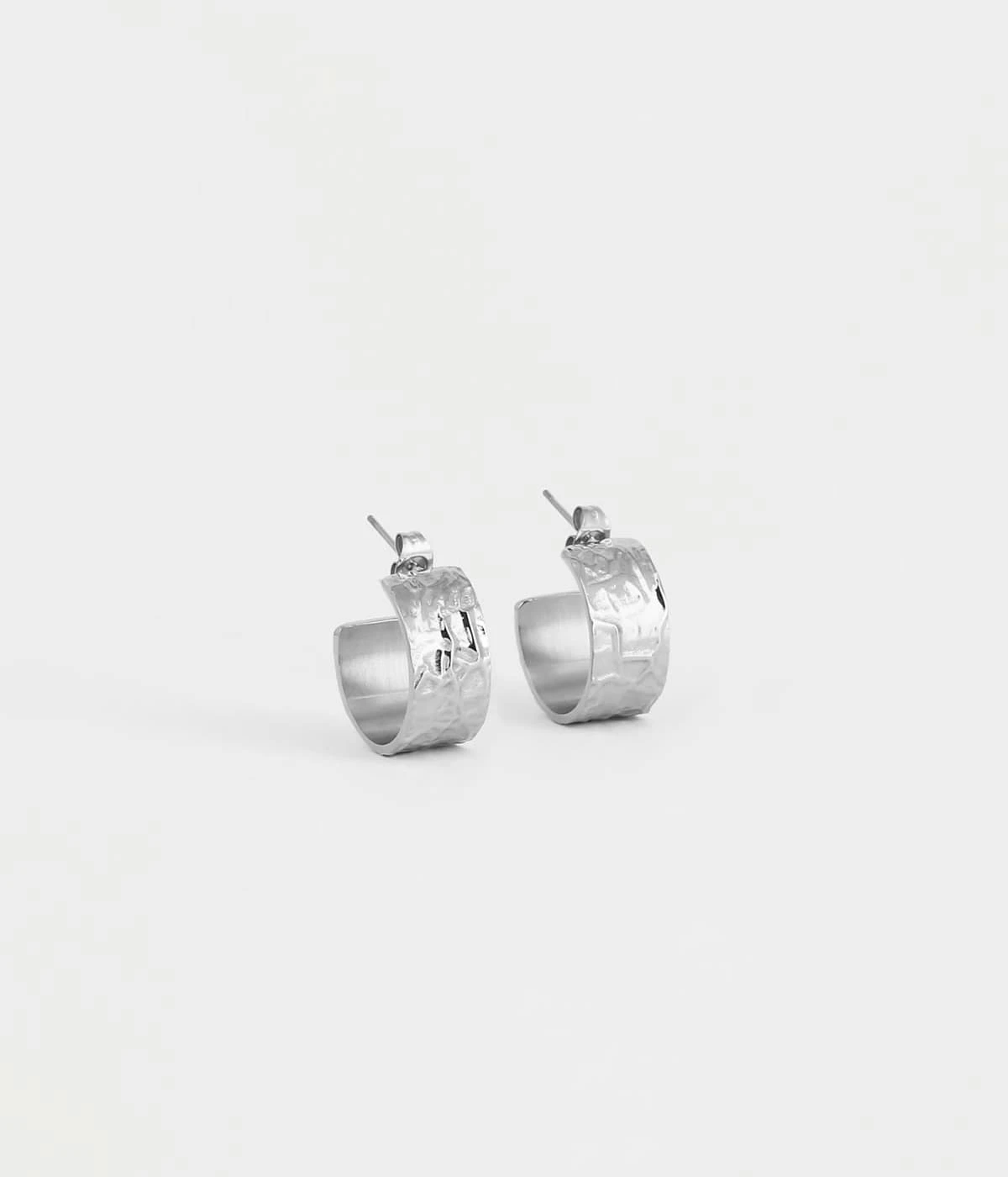 Boucles d’oreilles créoles en acier uni ou doré à l’or fin dont la matière est finement texturée.