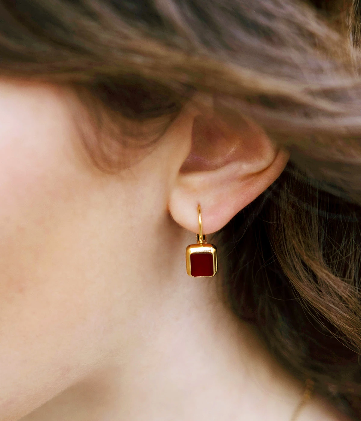 Boucles d’oreilles en acier doré à l’or fin présentant un motif rectangulaire de pierre naturelle.