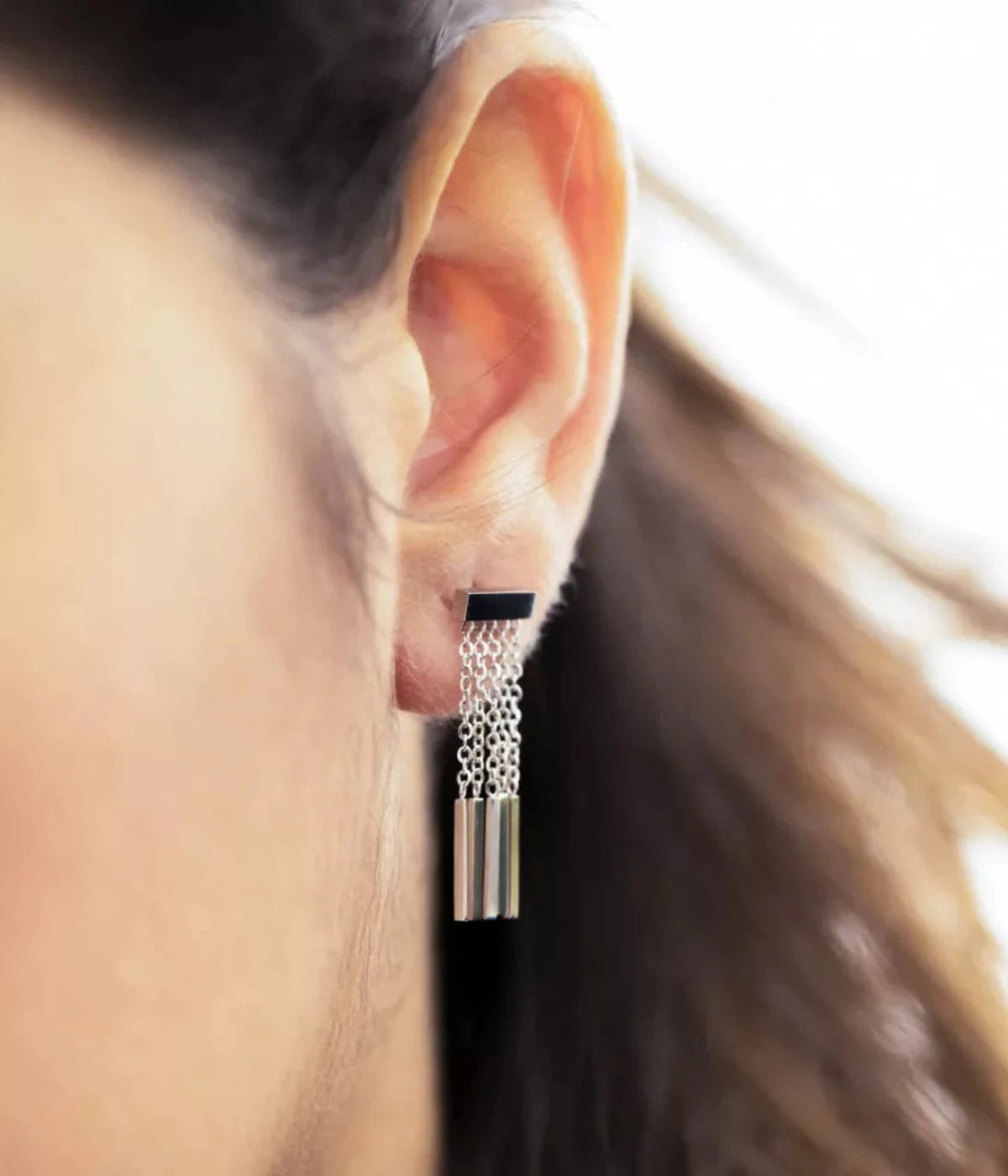 Petite pluie de chaînettes terminées de pampilles de métal pour ces boucles d’oreilles longues en acier uni ou doré à l’or fin.