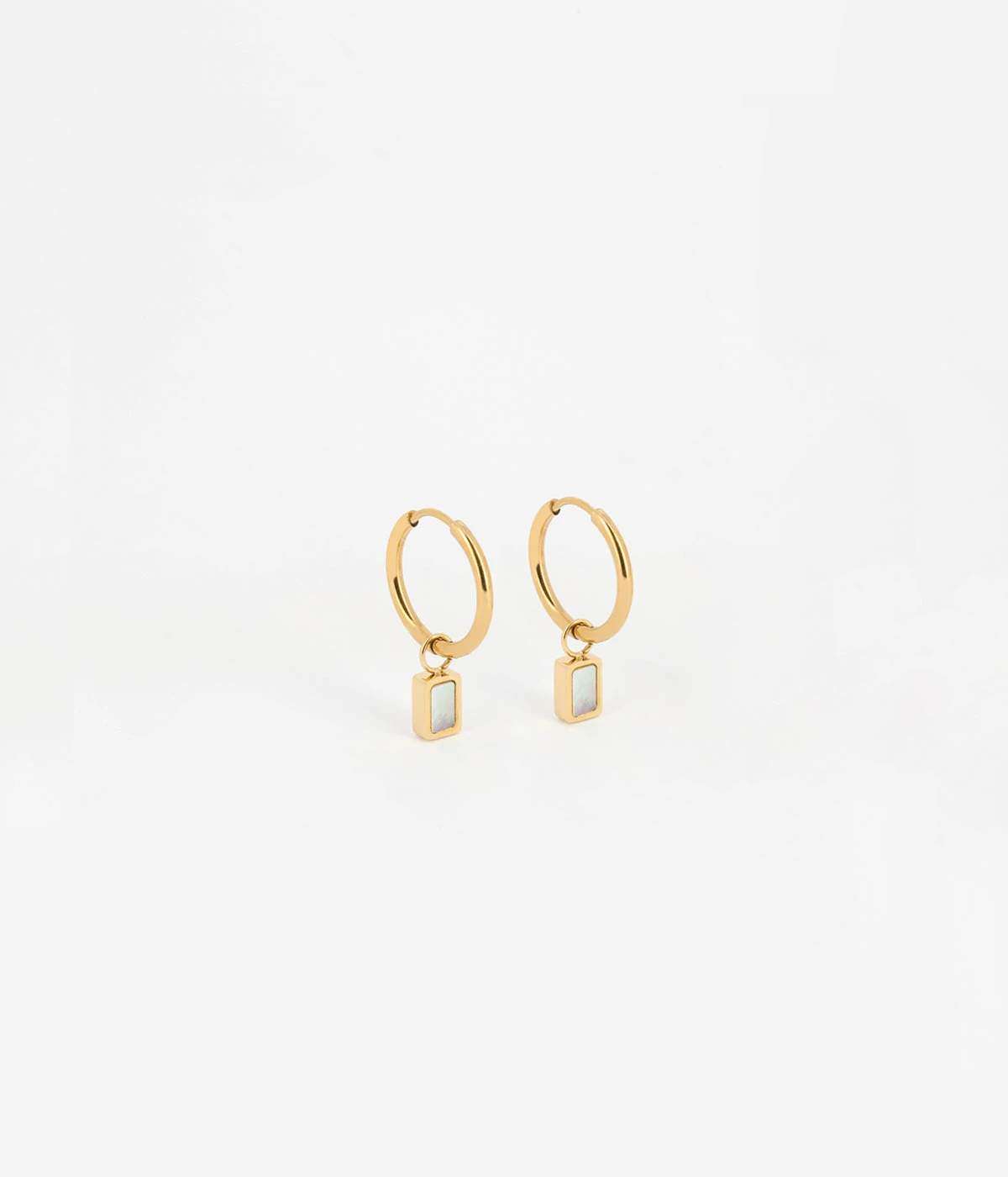 Boucles d’oreilles en acier doré à l’or fin sur lesquelles est suspendu un petit pendentif rectangle coloré.