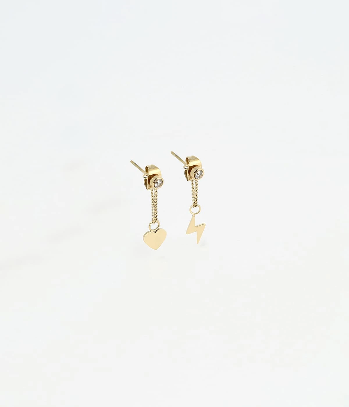 Petites boucles d’oreilles en acier uni ou doré à l’or fin sur lesquelles une petite croix et un cœur sont attachés à une chaînette.
