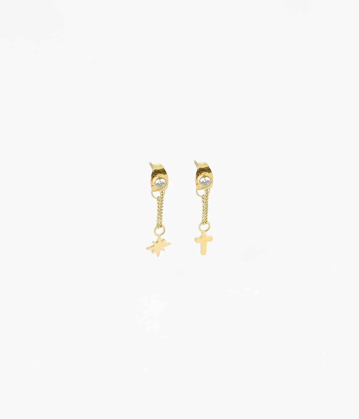 Petites boucles d’oreilles en acier uni ou doré à l’or fin sur lesquelles une petite croix et une étoile sont attachés à une chaînette.