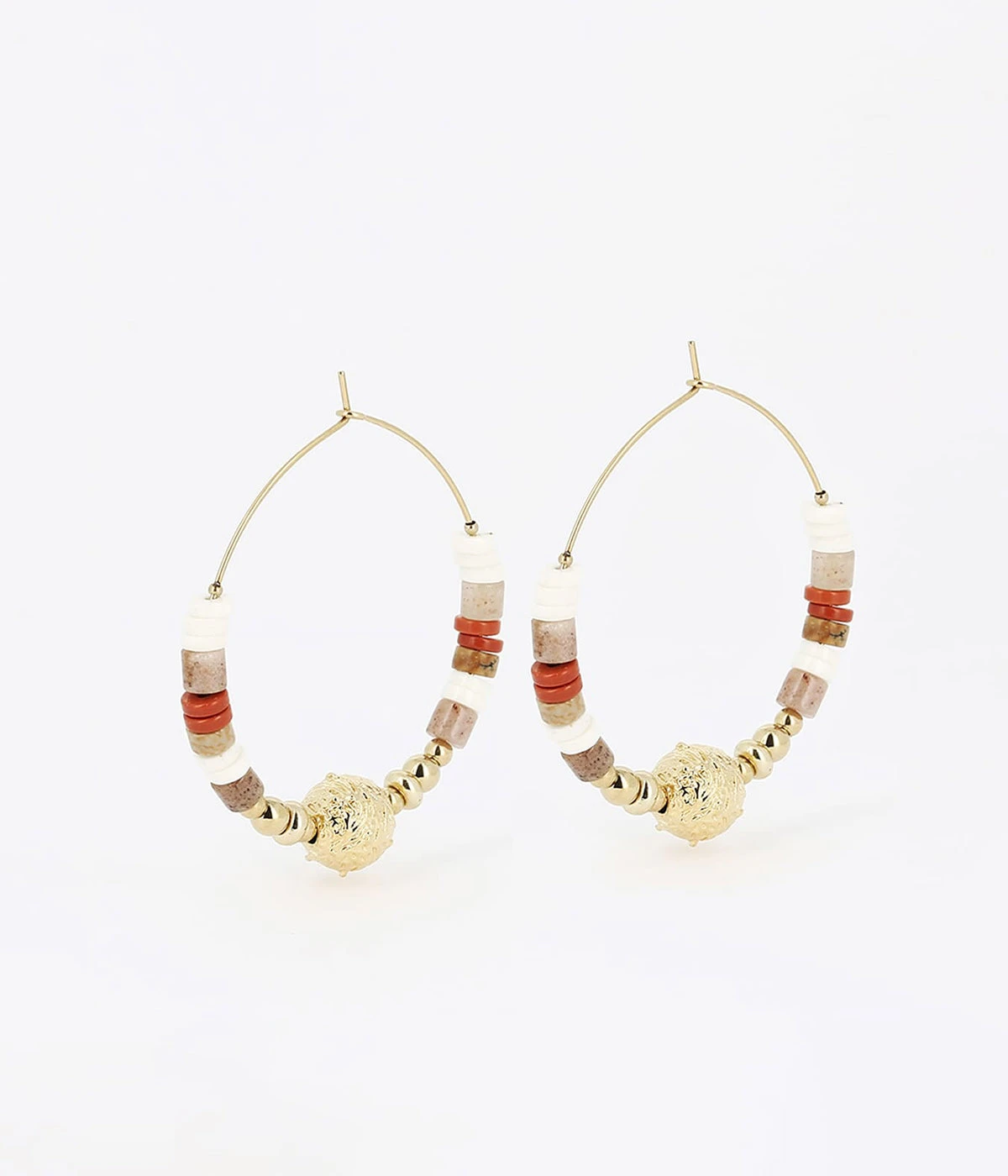 Boucles d’oreilles créoles en acier doré à l’or fin sur lesquelles sont enfilées des rondelles de coquillages blancs et de pierres fines.