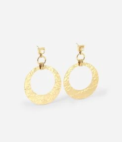 Boucles d’oreilles en acier doré à l’or fin. À la base se trouve une pierre colorée qui rattache deux anneaux dont l’un est martelé.