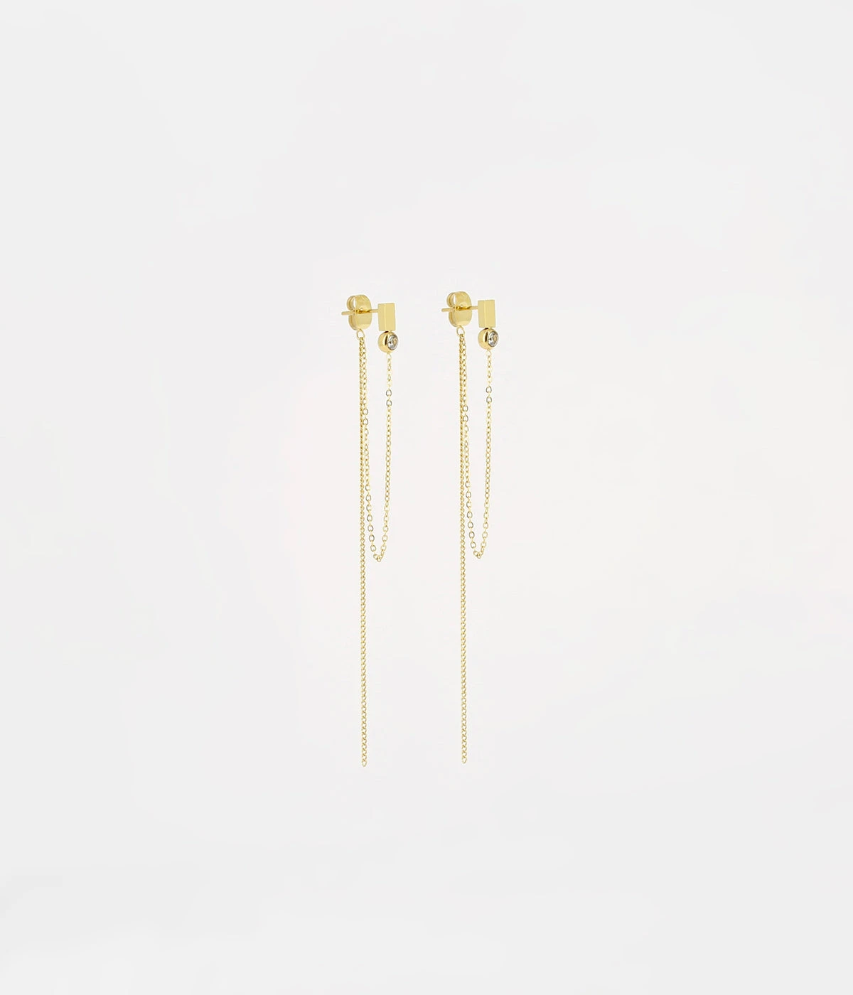 Boucles d’oreilles en acier doré à l’or fin composées d’un petit rectangle et d’un zirconium coloré.