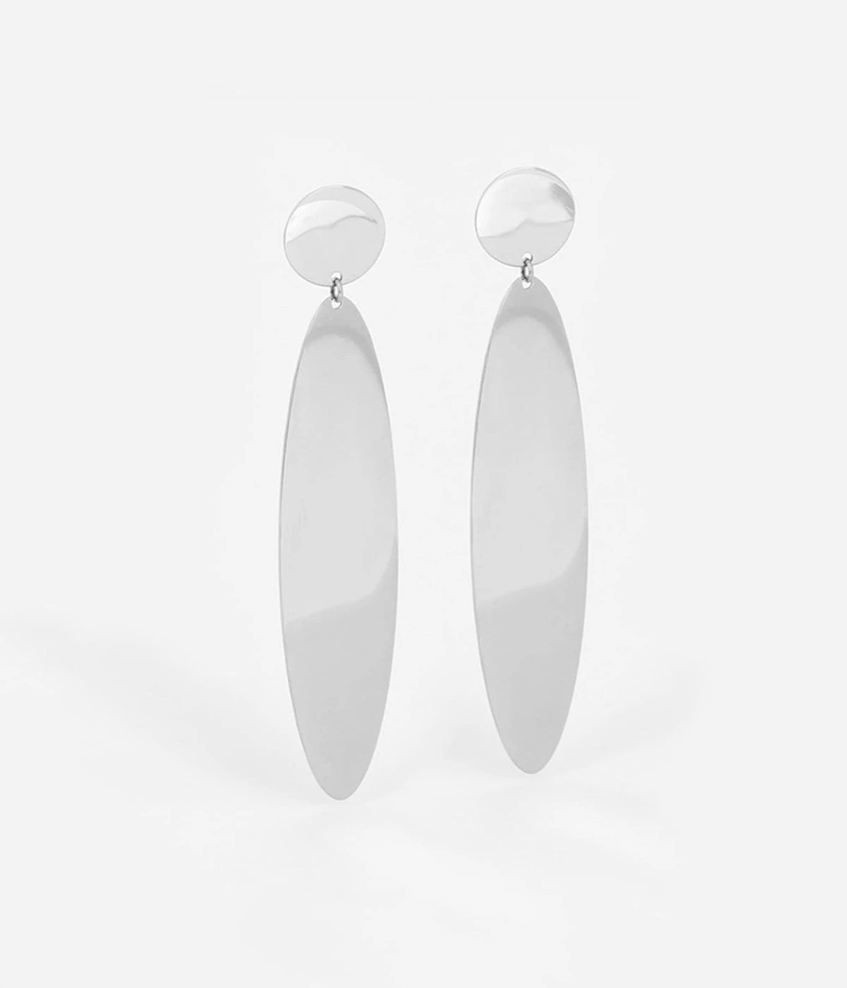 Boucles d’oreilles longues en acier uni ou doré à l’or fin de forme géométrique.