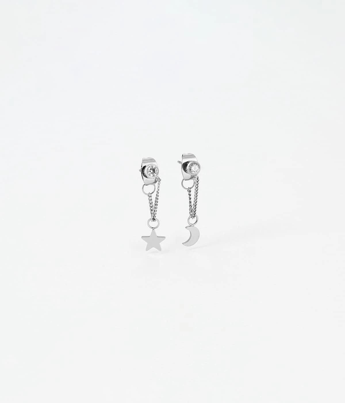 Petites boucles d’oreilles en acier uni ou doré à l’or fin sur lesquelles une étoile et une lune sont attachées à une chaînette.