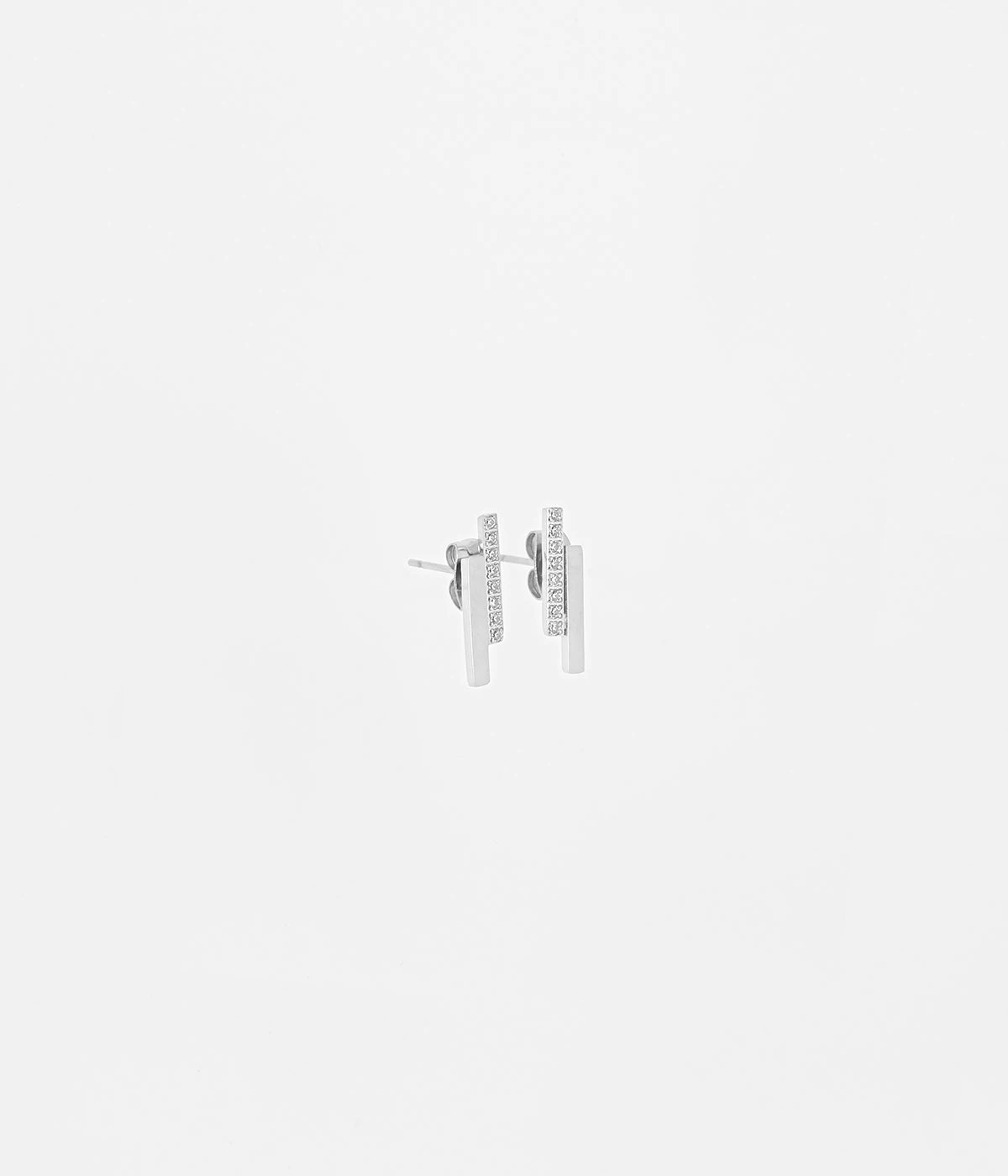 Boucles d’oreilles en acier uni ou doré à l’or fin en forme de barrette, dont l’une des deux est serties de zirconiums.