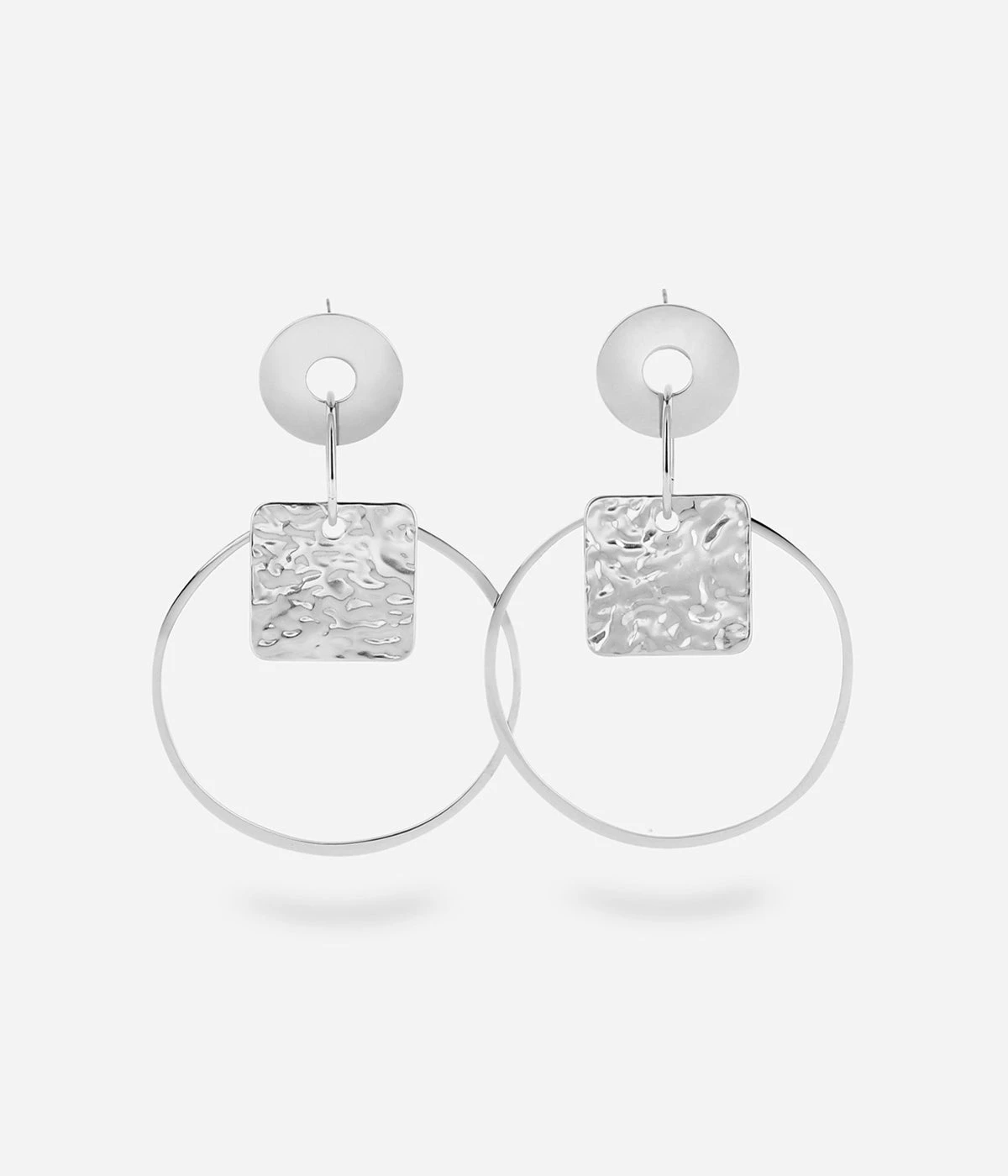 Boucles d’oreilles longues en acier uni ou doré à l’or fin. Éloge du carré martelé dans le cercle, ces boucles sont une association géométrique très contemporaine.
