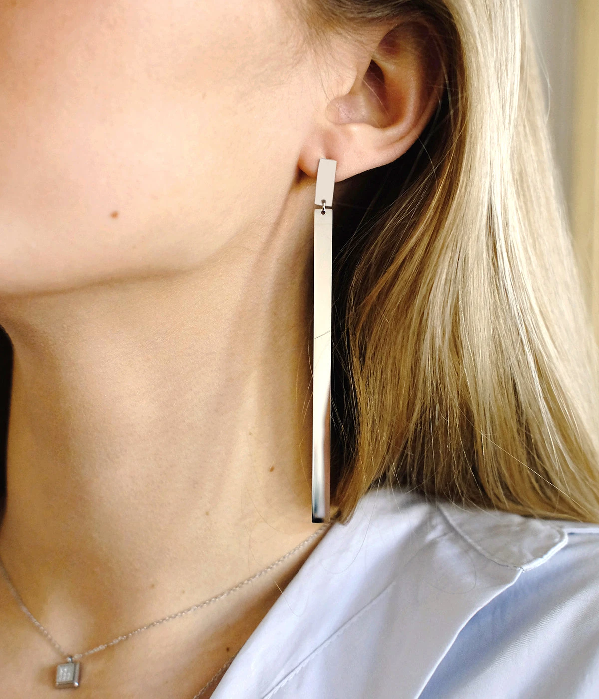 Boucles d’oreilles longues en acier uni de forme géométrique.