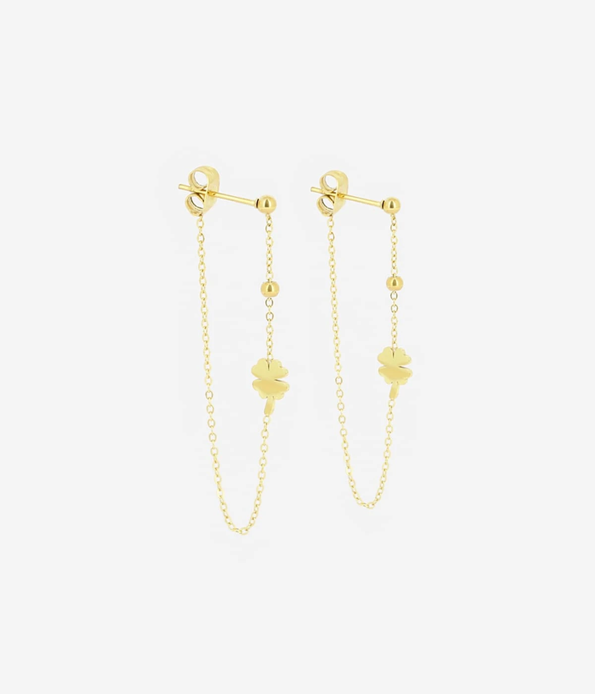 Boucles d’oreilles chaînette en acier uni ou doré à l’or fin. Sur chacune est délicatement attachée un trèfle à quatre feuilles.