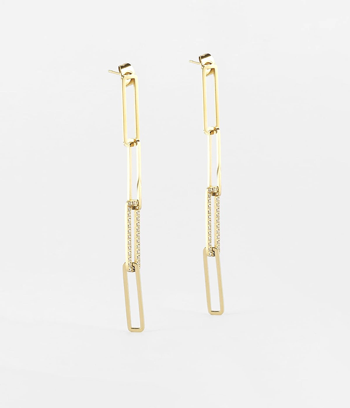 Boucles d’oreilles en acier uni ou doré formées d’une chaîne à longs maillons dont une sertie de zirconiums.