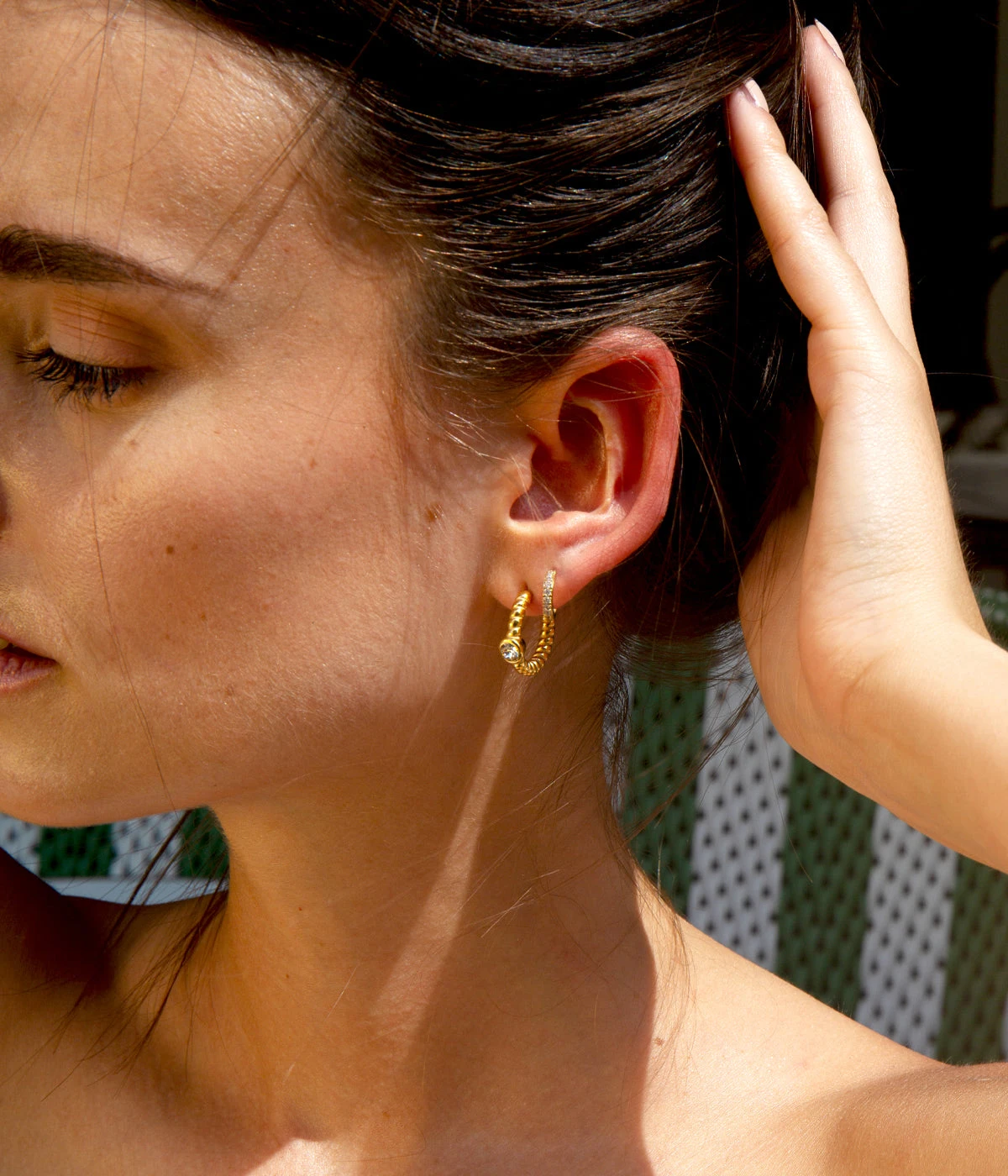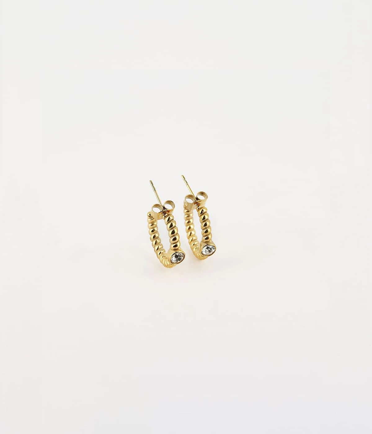 Mini créoles torsadées en acier uni ou doré à l’or fin avec en son centre un zirconium en serti clos.